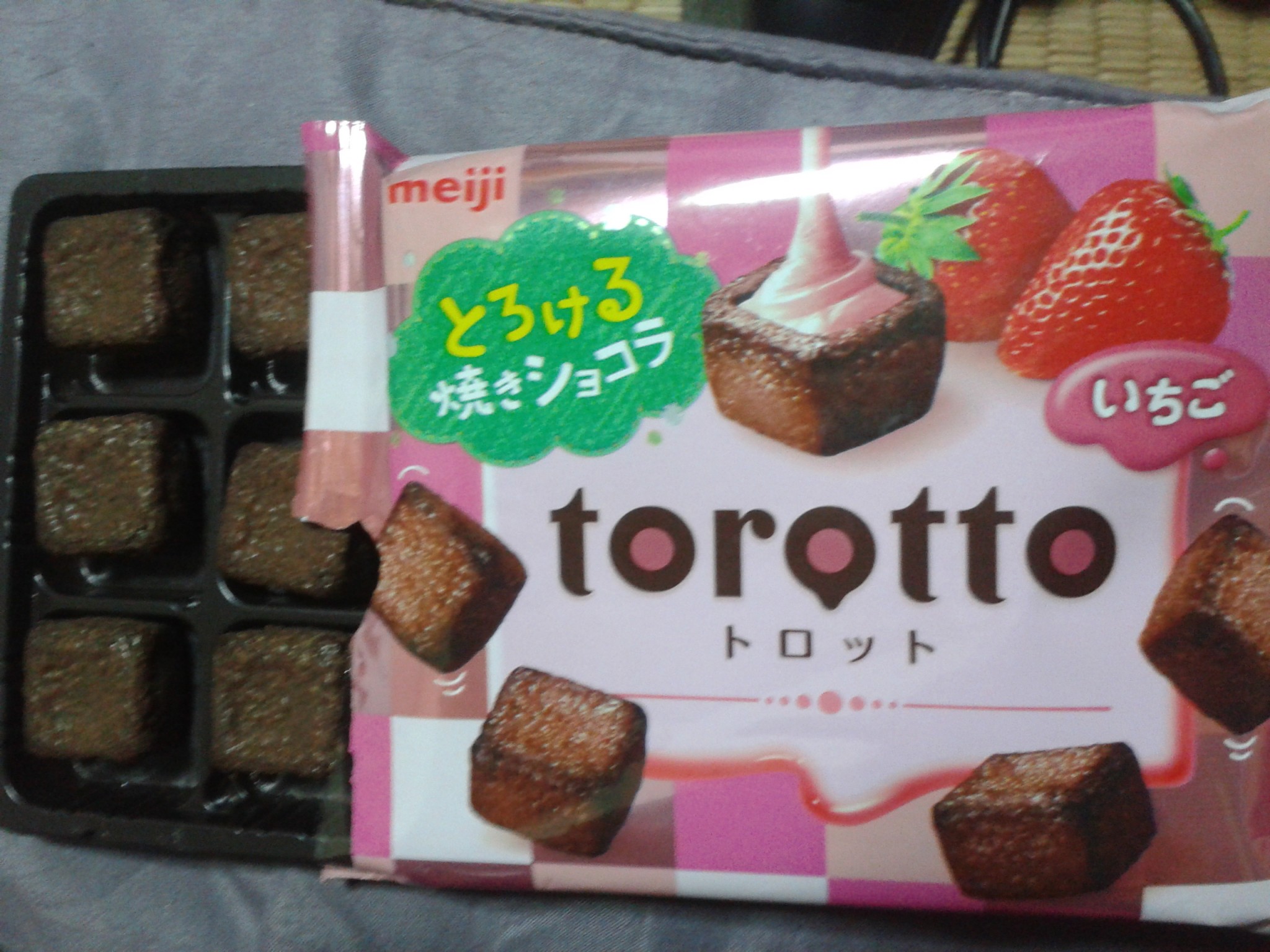 Firstly I am a little bit confused by all the strawberry-flavoured things around this time of year; I wouldn’t exactly associate them with winter, yet they are everywhere. Perhaps that is where the luxury lies. Torotto Strawberry confuses me for a second reason, as the word strawberry is written in katakana as oppose to Ichigo. The pack is otherwise pretty typical of the Torotto; we see some fondant being poured into a crunchy chocolate cube upon a square pattern. That firstly reinforces the gimmick of the square chocolate, and secondly is faintly reminiscent of a picnic blanket.
