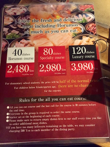 There are three options to choose from, each with a larger selection of meat. We went with the medium package, ¥2,980 for 80 dishes (the other two were 40 dishes for ¥2,480 and 120 dishes for ¥3,980).