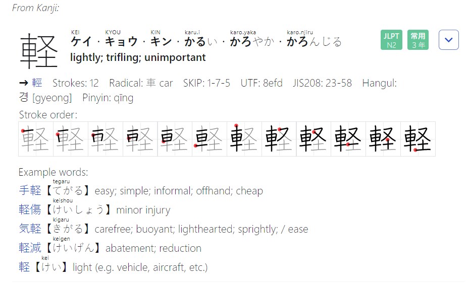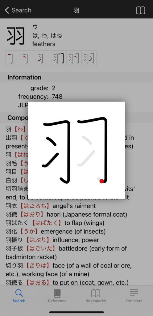 Jisho has some unique specialties. Firstly, the drawing function enables users to search for translations by drawing a kanji: start drawing, and Jisho will suggest various kanji. In addition, kanji can be searched by radicals, multiple search terms, tags, and hashtags. Tags are useful for identifying words classified by word classes, kanji classified by topics, joyo kanji (常用漢字, a literacy baseline of kanji to know for daily life in Japan), or words used in the JLPT exams (standardized Japanese-Language Proficiency exams). There is also a voice functionality where users can search by saying a word or a phrase.