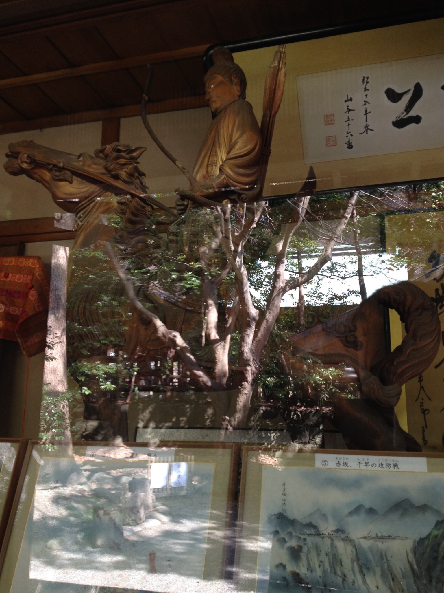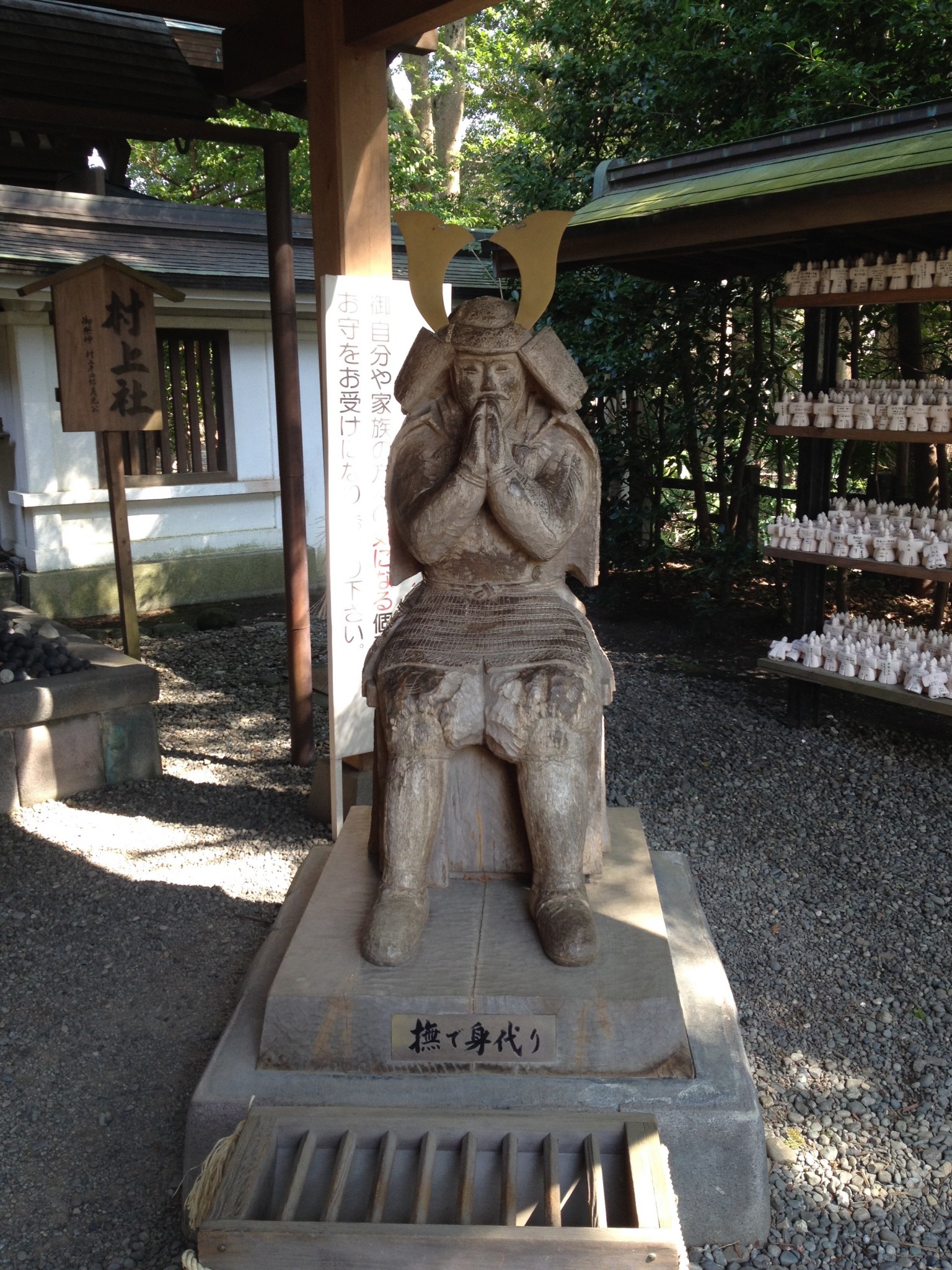 After walking through the shrine grounds, one can find a small, sitting statue to the right of the shrine. This statue of a seated samurai is said to heal ailments if one rubs the corresponding body part of the statue. The statue appears especially worn on the knees, a testament to the popularity of the area with hikers.