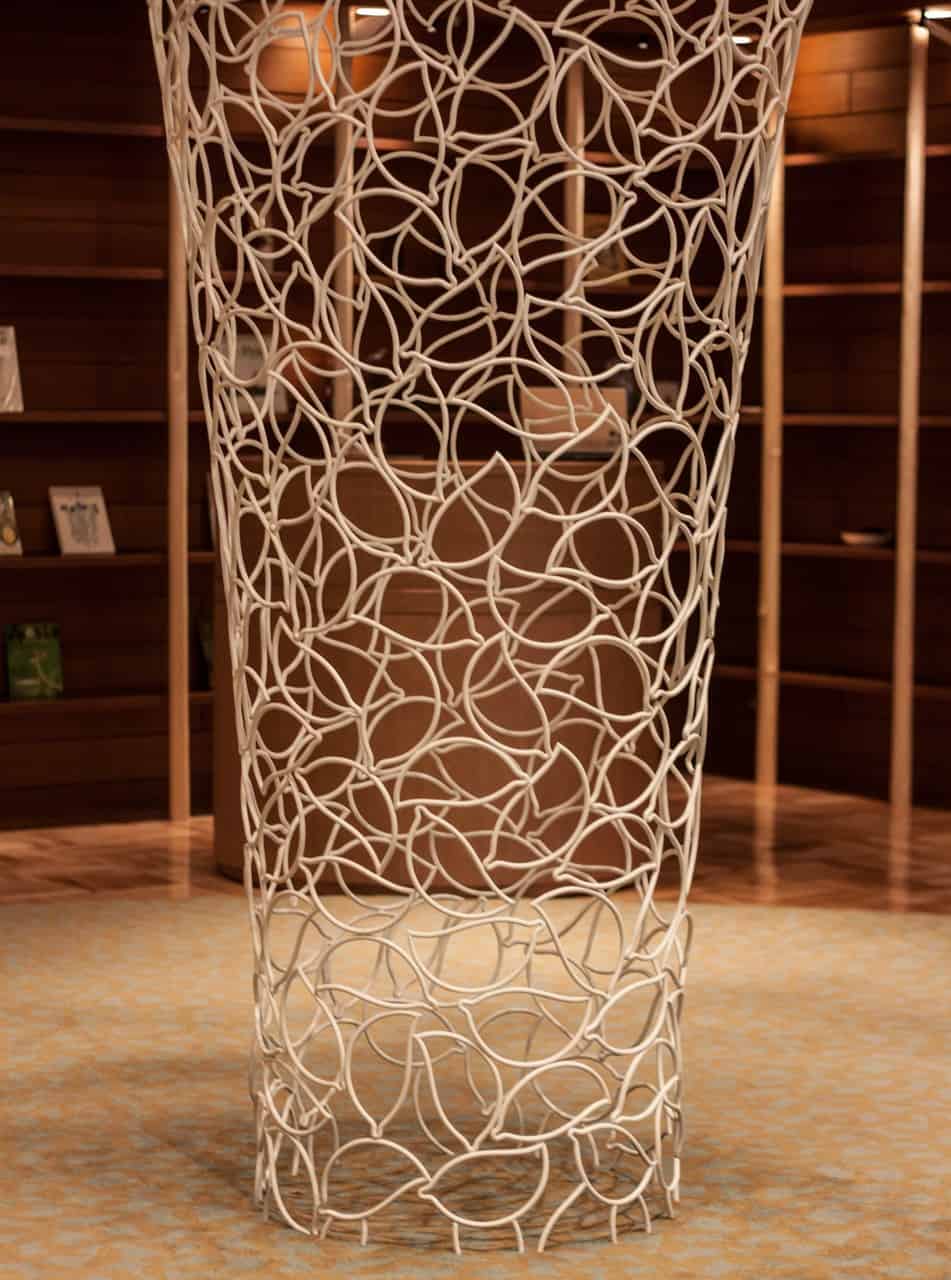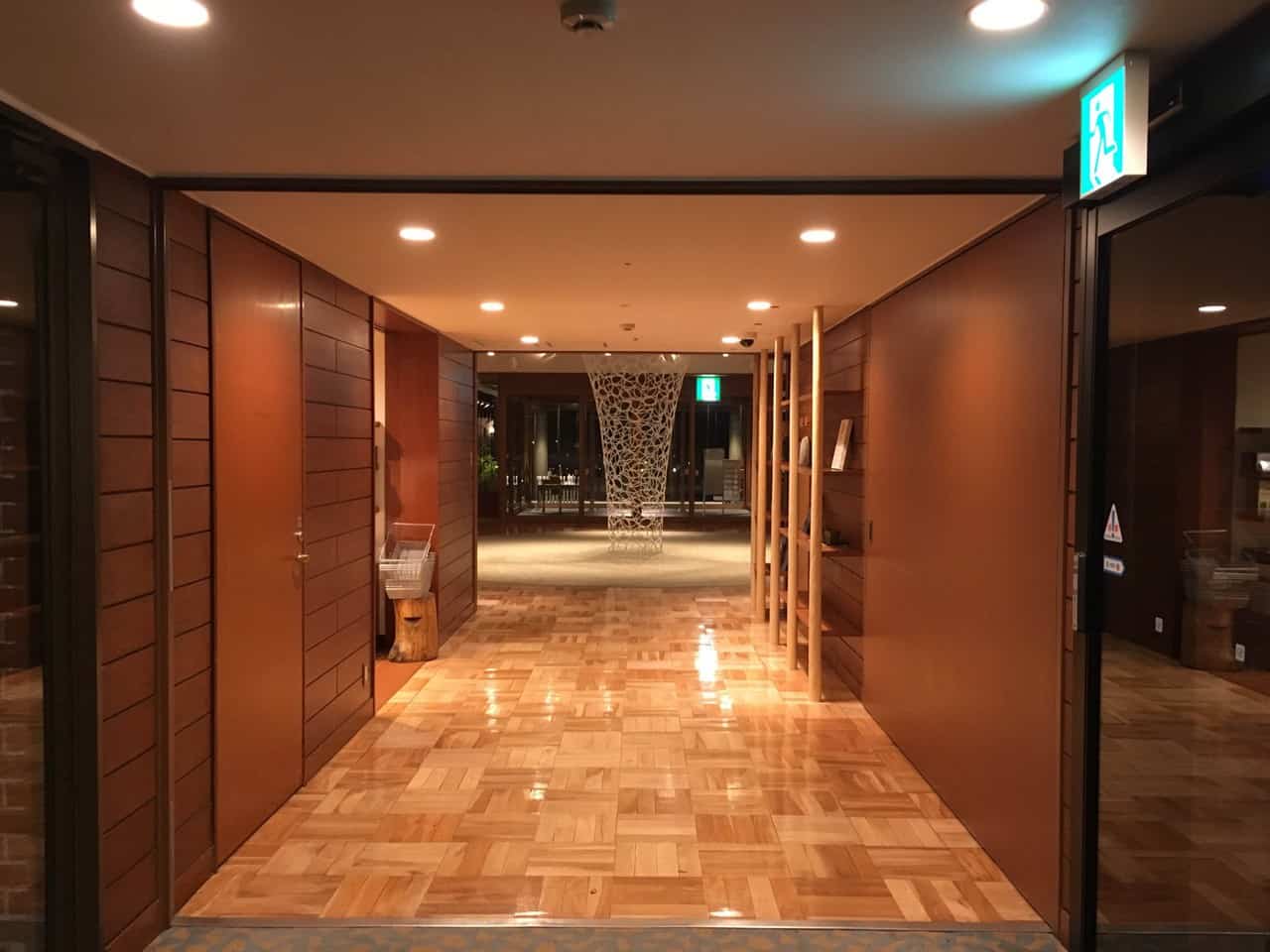 Upon entering Karuizawa Prince Hotel East, the interior design is one of the building’s first and most striking features. Smooth pine shelves line the walls, decorated with nick knacks, pine cones, children’s books, odds, and ends that invariably remind you of the natural world. The ceiling lights, partially shielded by leaf-shaped shades, diffuse the light into a soft natural glow, and the tall cylinder of white reminds you of a birch tree stretching towards the ceiling.