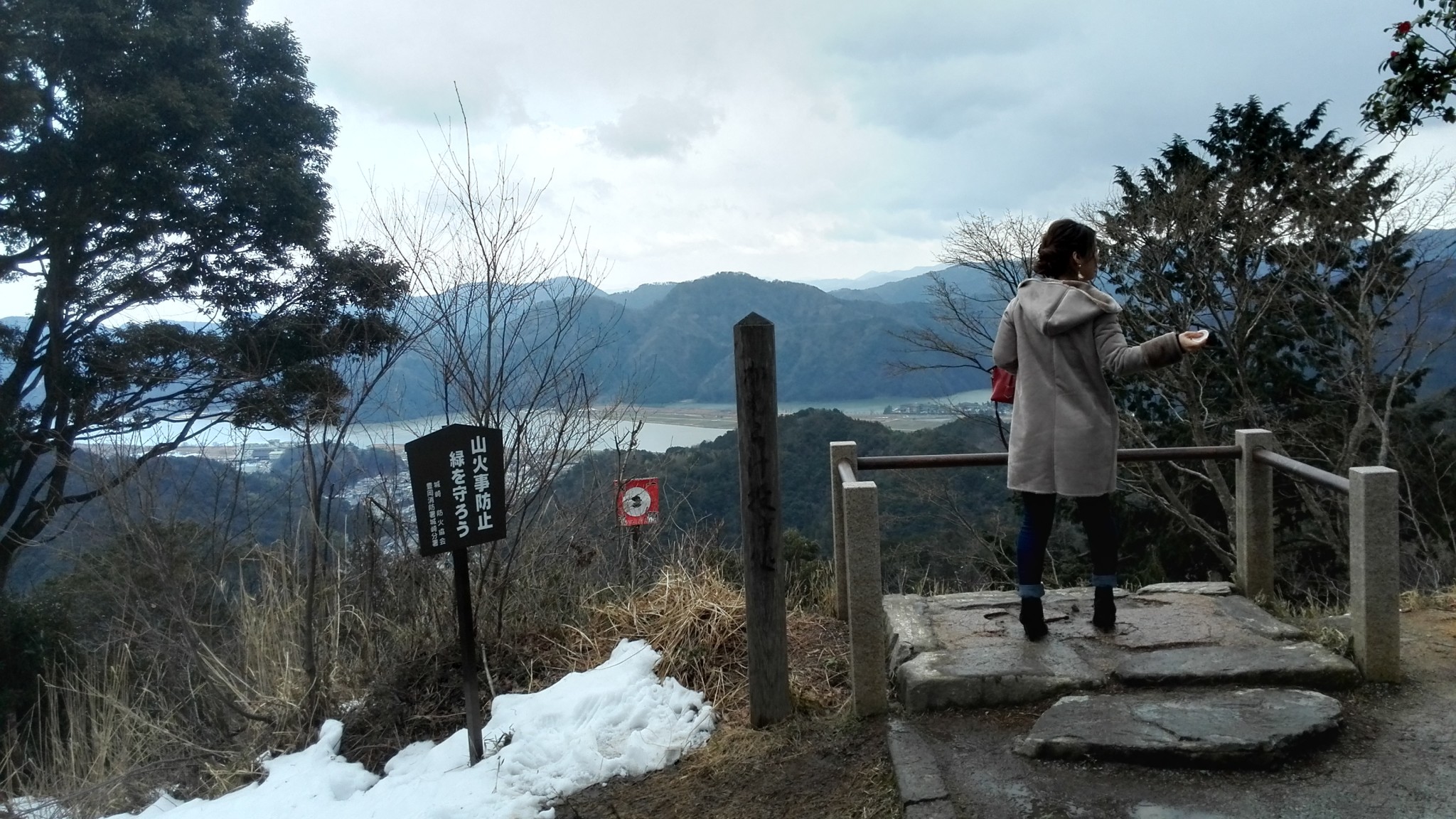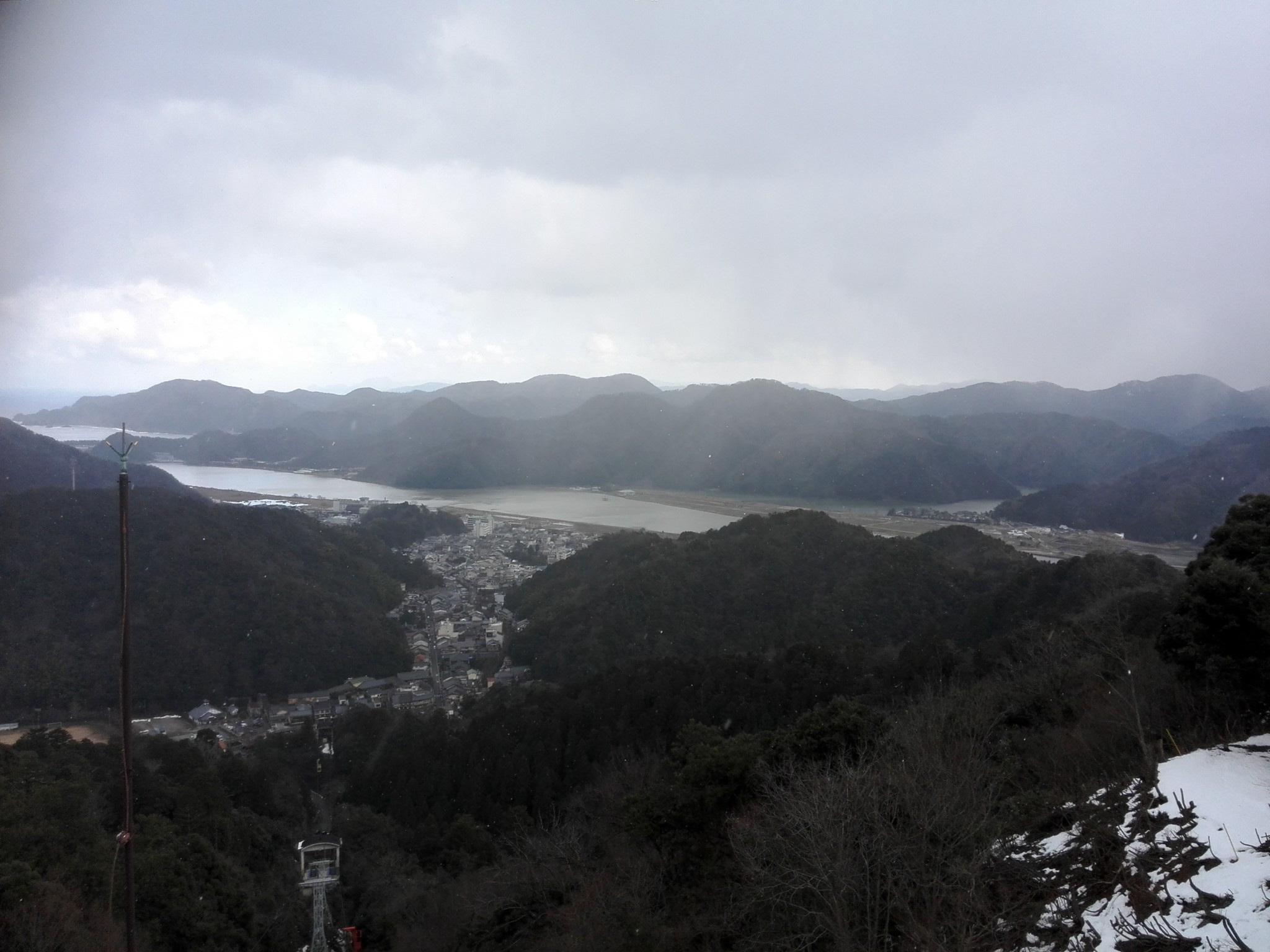 At the cable car station you can buy little clay disks to try and throw from the mountain to hit the target. The station also has toilets and a cafe. Going up onto its roof there is an observatory, where we can see as far as the Sea of Japan, and across towards Kyoto prefecture.