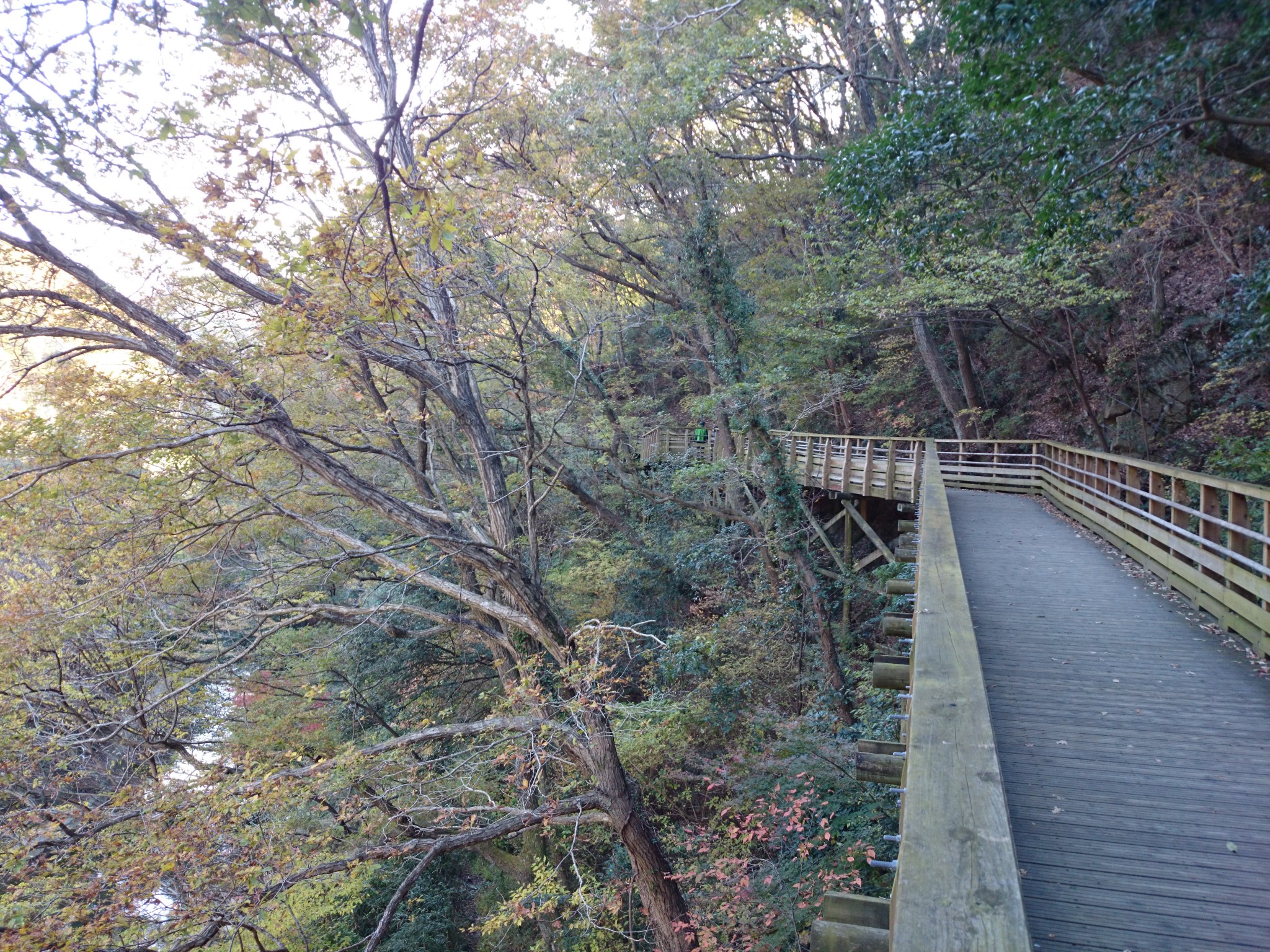 After coming upon a vehicle parking area, you’ll enter the park via a boardwalk. The boardwalk raises you up alongside a picturesque river, so you can get a nice look at the autumn leaves.