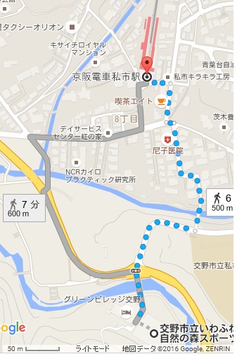 From Hirakatashi: Take the Keihan Katano line for Kisaichi to Kisaichi, which takes 13 minutes and 210yen. Then, from the train station you can follow the included map to a river area, where the path is fairly obvious from there.