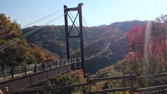 At the end of the path, we come across the Star of Blanco Bridge! (星のブランコ) Crossing the bridge is a really fun experience because you can look out over the autumn red leaves, and feel the swaying as you cross. Make sure to look down from the bridge and see if you can recognise the path you took earlier. Did you notice there was this giant bridge over your head when you were down there? The bridge is 280 meters long and 50 meters high at its tallest point, making it the largest wooden foot suspension bridge in japan.