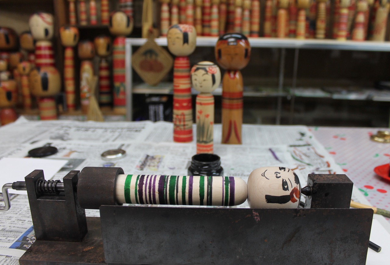 After designing the face on paper, your cultured-hands will be unleashed onto the real thing! No need to worry though, as the your host will happily guide you as little or as much as you need. Once you’re satisfied with your kokeshi’s face – or like in my case, you don’t want to ruin it any further – the kokeshi is placed into a lathe to paint the ‘Tsuchiyu typical’ stripesaround the body and head.