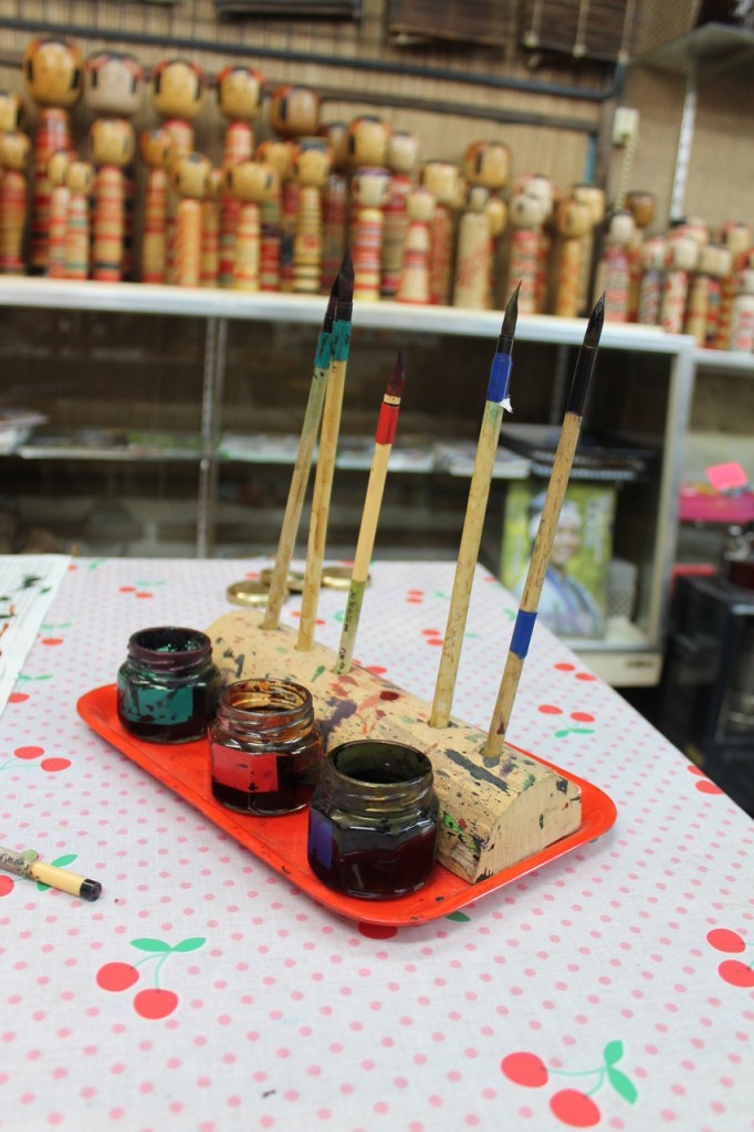 Firstly, you will design the face of your doll using the paintbrushes and a small piece of paper. If you’re somewhat heavy handed (like me) then this also allows you to practice your paintbrush technique. Looking around the store, you may see how fine the lines are on the faces of the kokeshi… If you’re up for the challenge, you can try to replicate them!