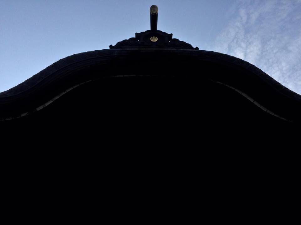 Besides the gate, Myotoku-ji Temple has two traditional structures. The shogo (belfry) is tagged to the gate like an offshoot. Backed by a looming hill and its abducting shadows during late afternoon, the meditation hall oversees the grounds. The sounds of lecture and chant stirred inside, though at first the sound seemed to drift from the woods. Sound was strangely displaced in the central courtyard. It carried light spring sounds, tempering the temple’s dark beginnings soothingly.