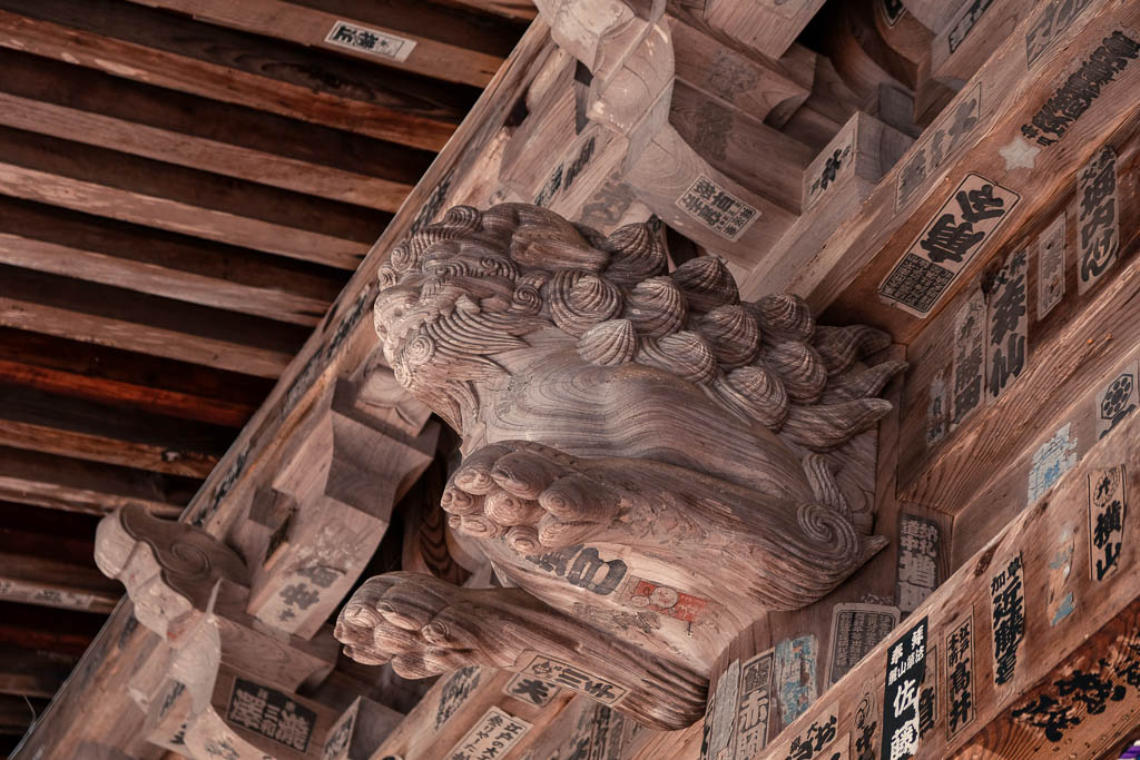 Detailed shot of a wood carving within the temple’s eaves