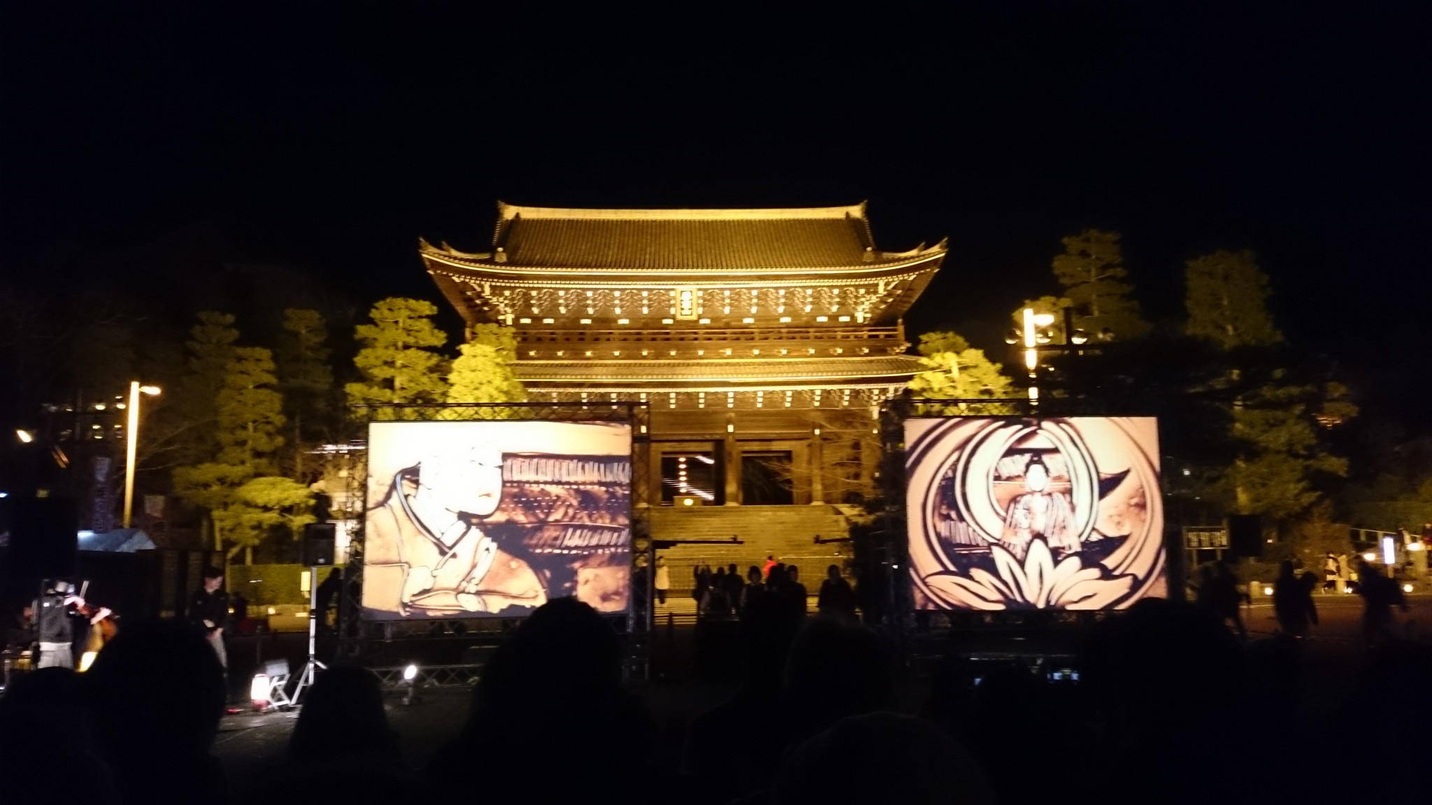 One of the performance areas is outside the Chion-in temple, which you can see in the background. In this performance, the performers were playing traditional Japanese instruments and a violin; the sounds really suit each other. At the same time as the music was playing, artists were making live art by pouring sand onto projection lamps. This was really amazing to watch as they were continually transforming one picture into another, and with impressive clarity and detail.