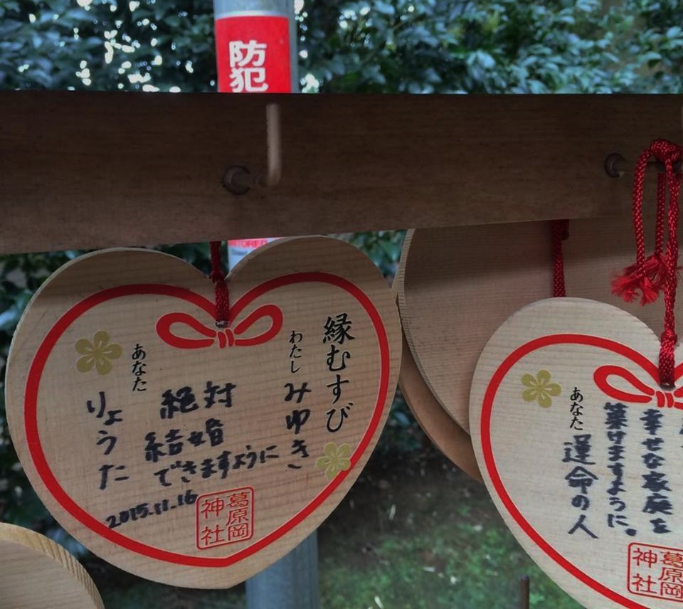 The shrine stood stilted and tectonic-bare. Its color was bare-body too, presenting itself truthfully to all those searching for love. It held a collection of heart-shaped ema (prayer tablets).