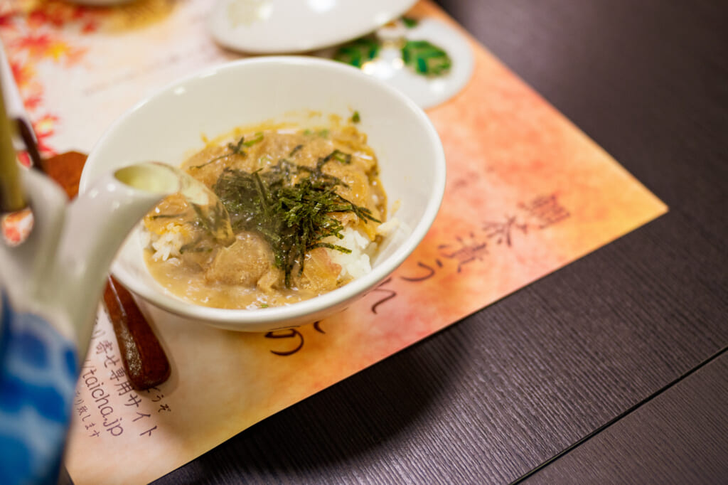 Tai chazuke is actually a simple dish: slices of tai (sea bream) over rice, flavored with a secret sauce. Green tea is poured over the top, and it is eaten like a soup. The green tea allows the flavor of the sesame-based secret sauce to shine through. The secret recipe has been handed down orally through the centuries. When asked about it, Goto-san jokingly motioned to a katana sword displayed nearby, saying the ghosts of his ancestors would have his head if he tried to reveal it to us.