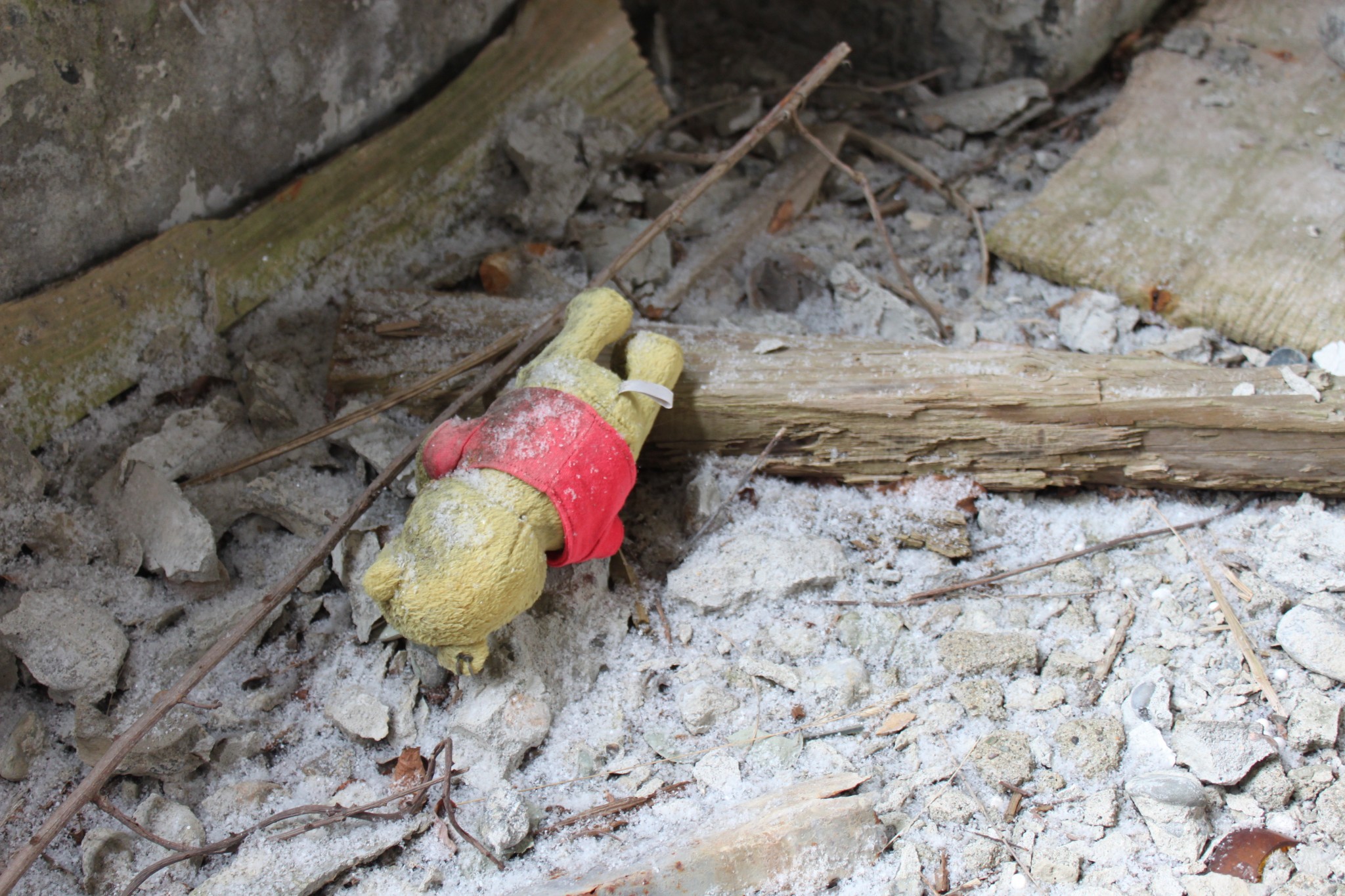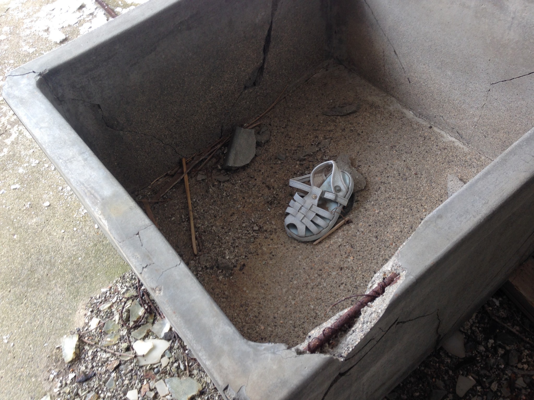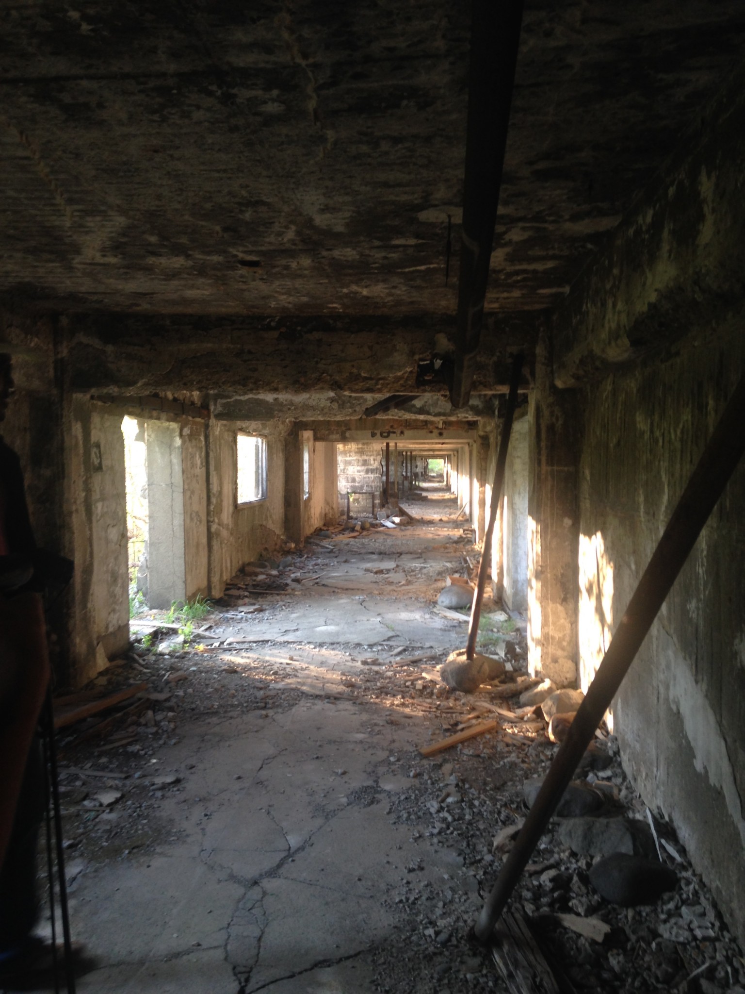 We wandered the bottom floor, ducking our heads into rooms littered with abandoned personal belongings. A single shoe left behind in the hallway, a half-empty glass bottle of medicine, forgotten on the shelf. Most of the porcelain and pipes used in the bathrooms had been scavenged or broken. Wandering up the central stairs, we found the public baths; a large concrete tub occupied the center of the room. The ceiling had partially caved in, and we were cautious about walking in too far so we headed back, careful about where we placed our feet, as many of the floor boards were rotting.