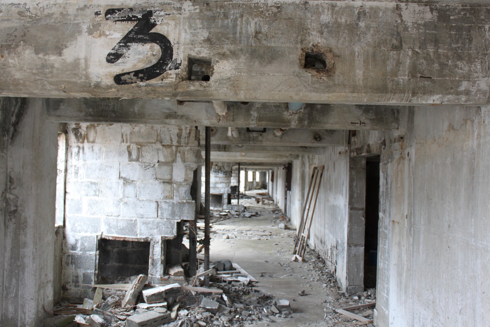 There are 11 apartment buildings, and each block raises four floors from ground level. Entering the closest building through a giant hole in the cement, the hallway stretched before us. Rubble and crumbling concrete spilled off of the walls in heaps, and BB pellets littered the floor. Graffiti was smeared across some of the walls, and small trees and shrubs had pushed themselves through the concrete floor, their roots finding purchase among the rubble.