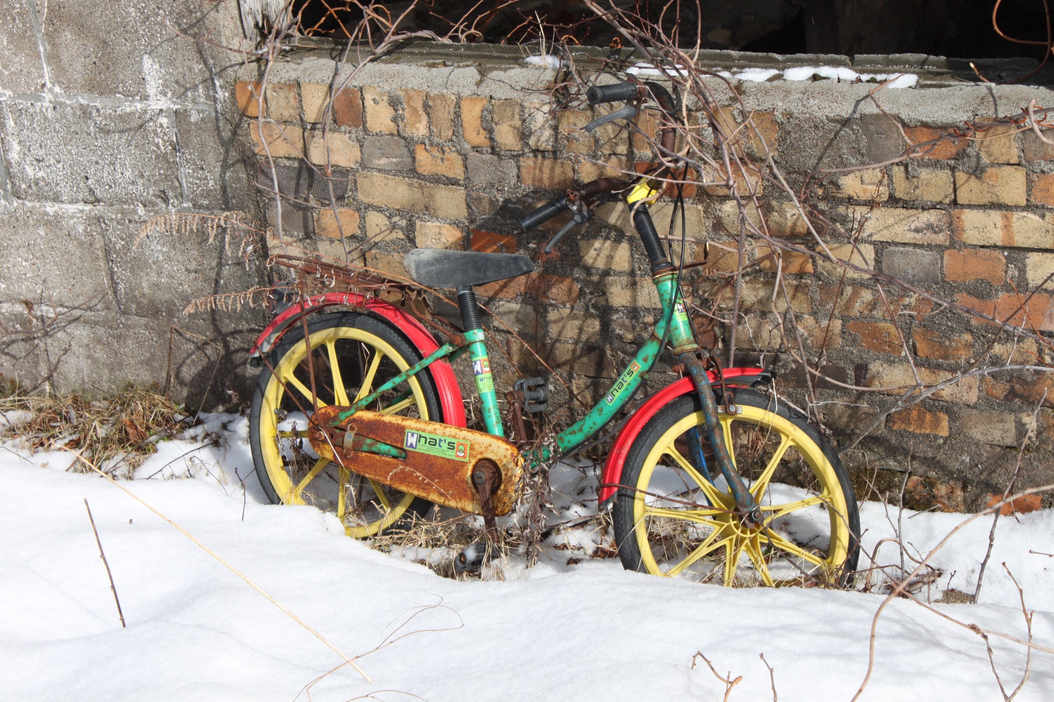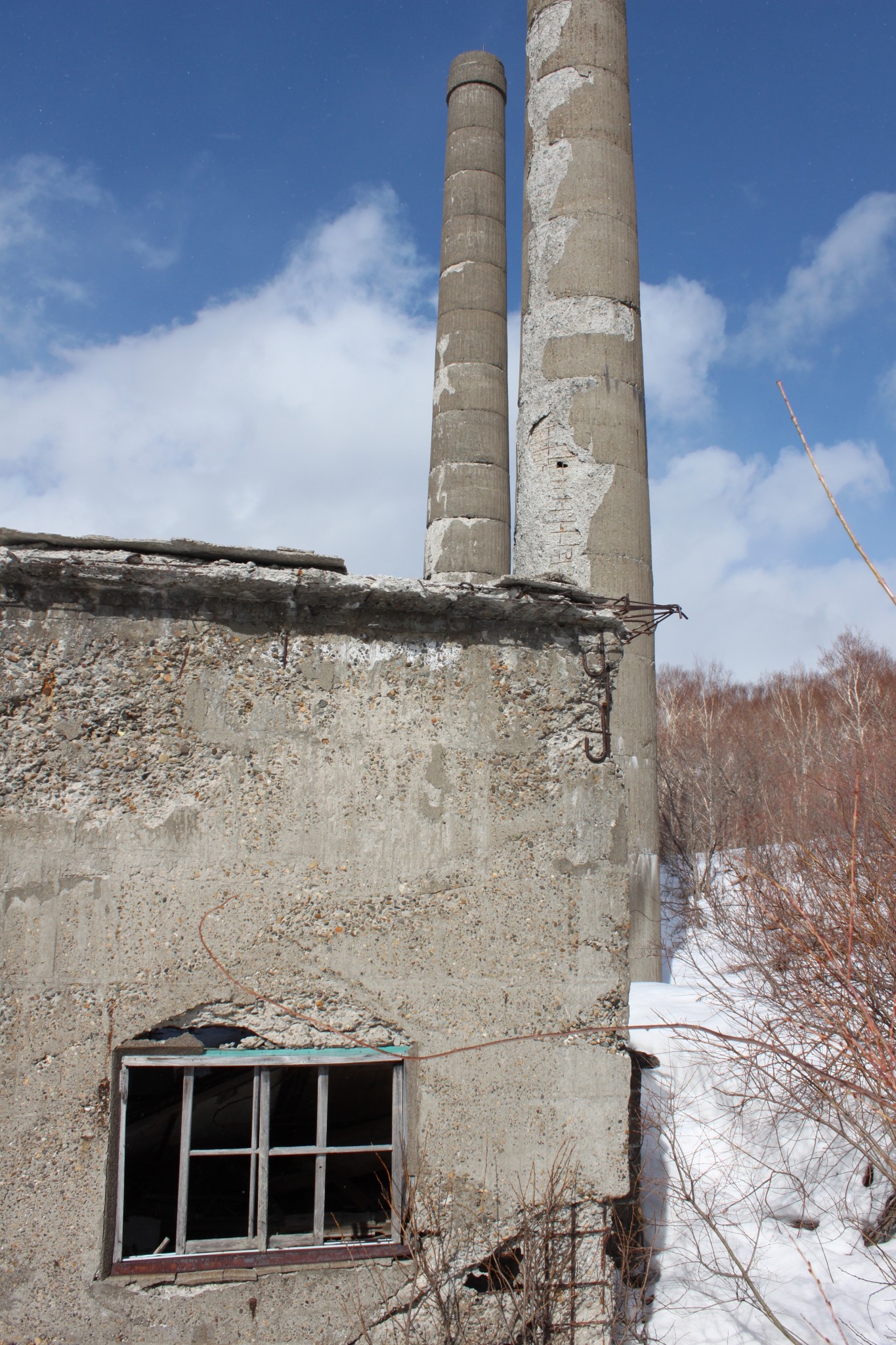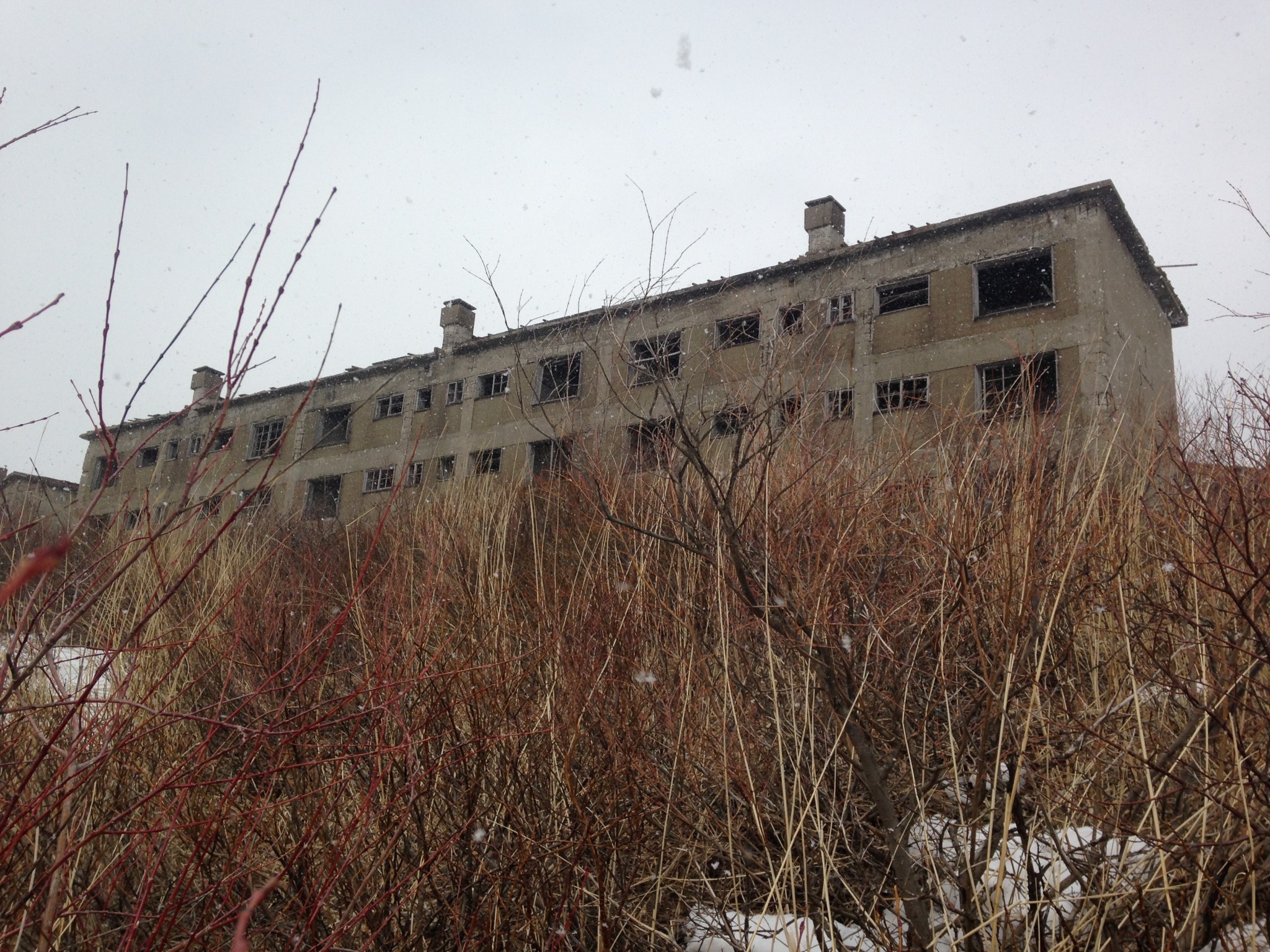 On my second trip to Matsuo Kouzan, I was with a more adventurous group. As we walked down the paved path parallel to the buildings we told each other ghost stories, fearless because it was mid-afternoon and the sun was shining. We had to force a bit of a path through the undergrowth and snow to reach the closest building, but it was clear other people had traveled through the area recently.
