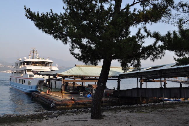 It takes close to an hour from central Hiroshima city to get to the ferry port for Miyajima (Hiroden-Miyajimaguchi). Once you’re there, you’ll see that there are two ferry options. Don’t pay the extra fee by mistakenly using the JR ferry! To your left is the Miyajima Matsudai Kisen tourist ferry. This is the ferry you want. There are indoor and outdoor seats; typical outdoor benches to comfortable velvet momiji-printed sofas. It’s only a ten minute ride but make sure to poke your head out onto the third floor to catch the beautiful mountain views. You’ll even see the famous Torii gate out on the water.