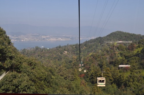 At the midway station, guests switch to take a much larger and newer gondola that fits 30 people. A recorded voice welcomes you and explains in Japanese and English the history of Miyajima and the significance of Mt. Misen. Meanwhile, guests enjoy the glistening view of the Setouchi Inland Sea where, on a clear day, Shikoku island is visible among many other islands floating at sea. All of these islands including Miyajima are part of the Setonaikai National Park.