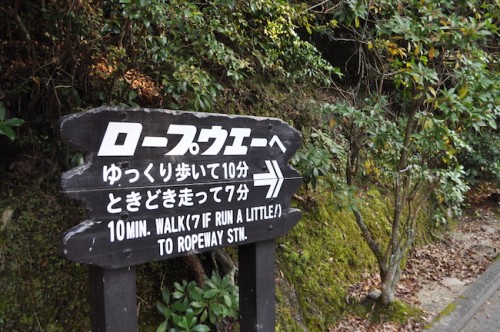 A stroll past other visitors, the vendors, a quick glimpse at the Torii gate in the water, a skip behind the Itsukushima Shrine…and you will enter the thick forest of Maple Valley Park, Momijidani Koen. Here, a few degrees chillier from the sunny outskirts of the island, you’ll find a trail leading to the mountaintop. If you have a dog companion, or if you’re eager to trek, an hour or two-long trails will lead all the way up the mountain. But the more popular – and I would say even more of a beautiful – option is to take the Miyajima Ropeway. You can get a discount for the round trip fair cost (¥1,350 instead of ¥1,800!) by combining it with the Hiroden one-day pass.
