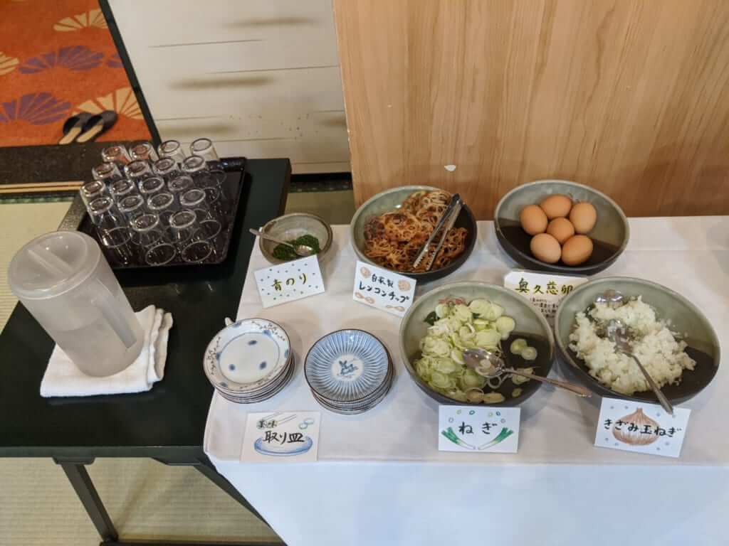 The following morning I got up rather early, donned my yukata again, and went to breakfast. Unlike dinner, breakfast was served in a banquet hall on a different floor. Breakfast was arrayed much like dinner, all tiny dishes to experiment with, and I also had miso soup and as much rice as I wanted. There were fixings on a separate table to make neba-neba don, which is a combination of natto (fermented soybeans), okra, raw eggs, spring onions, and soy sauce all mixed together and eaten with a bowl of rice. It’s somewhat of a brave choice for a tourist visiting Japan for the first time, but it should definitely be tried at least once. Having gotten used to this kind of dish a while ago, I made a bowl for myself and enjoyed it with breakfast.