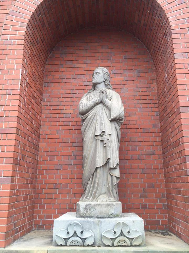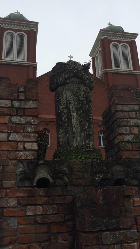 Outside, St. Mary’s Cathedral brings an uncloaked face to bear upon Nagasaki. The building’s Romanesque symmetry is unsullied. At the entryway, however, an ungloved hand out of the ugly past presents itself. Statues, both full and headless, crack like stubbed old fingers. They creep from the cuff of tattered dress, mottled red and molding green. These original bricks and icons were those which withstood the destruction of the atomic bombing of Nagasaki.