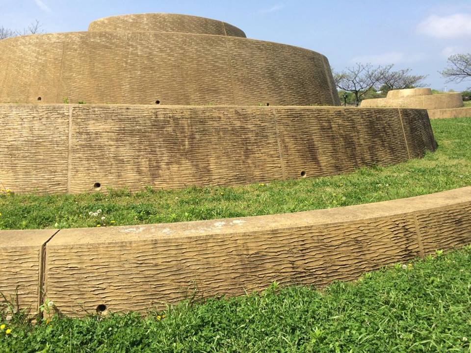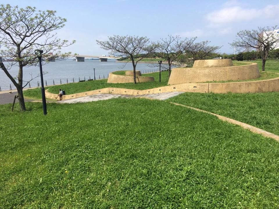 The park’s pathways slither thinly and often unseen, walking barefooted through the green. The end closest to sea has picnic benches and rock gardens, but the more attractive element are the installation pieces. Their crimped sides and cream color resemble the baumkuchen so popular in Japan, and they’re not to remain untouched in a glass display. Leading to a small dirt patch, they allow a walk to freely touched winds.