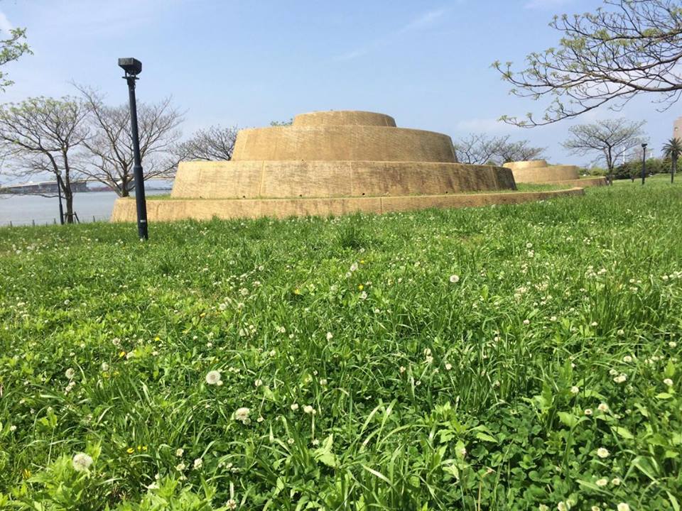 The green patch of the castle park looks out over Fukuoka. When erected, the castle had looked over green. When it was transported away, it must have conceded to the concrete of today in exchange for being a refuge for reclaimed nature. Continued human influence on Fukuoka’s alluvial plain came to include a bustling port. In turn, an area known as Mirai hundred-year park was given to the grasses the same as the neighboring Najima castle ruins.