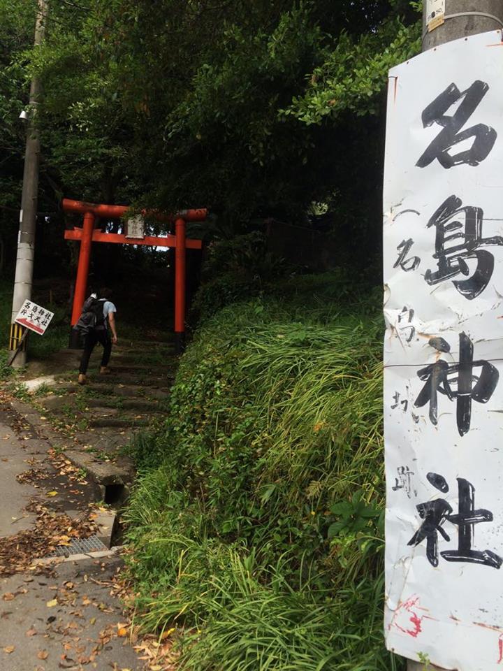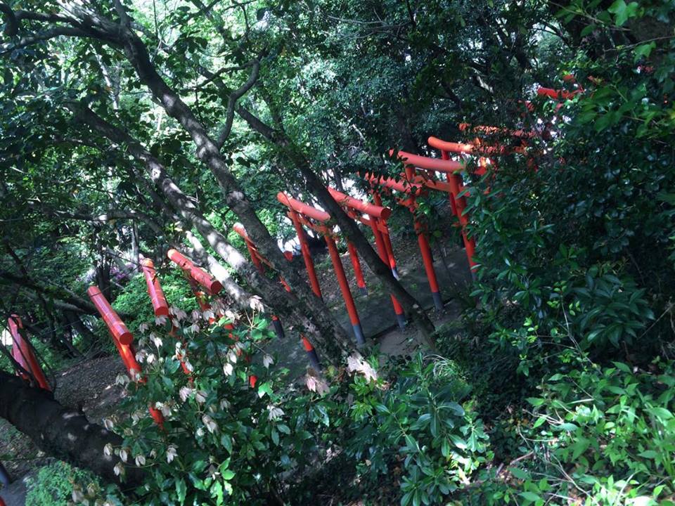 The Najima castle ruins are reached through the adjacent Najima shrine. Rowed orange torii wave into the woods, below the apex only in elevation. Markedly well contrasted over other such row examples in Fukuoka city, they square dignified shoulders by a sloped wash of green.