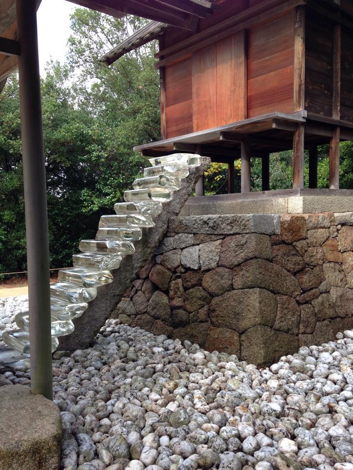Peeking into the next level of forest, we found a Naoshima art house of a different sort. To our side, partly shaded in canopy and partly by clouds, was a shrine on stilts – the recently redesigned Go’o shrine. Despite darkness overhead, the structure and it holy plot of land seemed light. Placed evenly in the rectangular space were thousands of smooth white stones that held light like a secret blue lagoon.