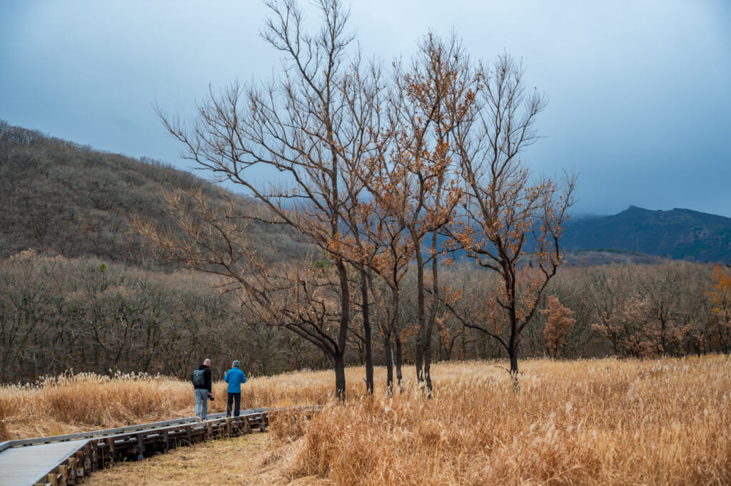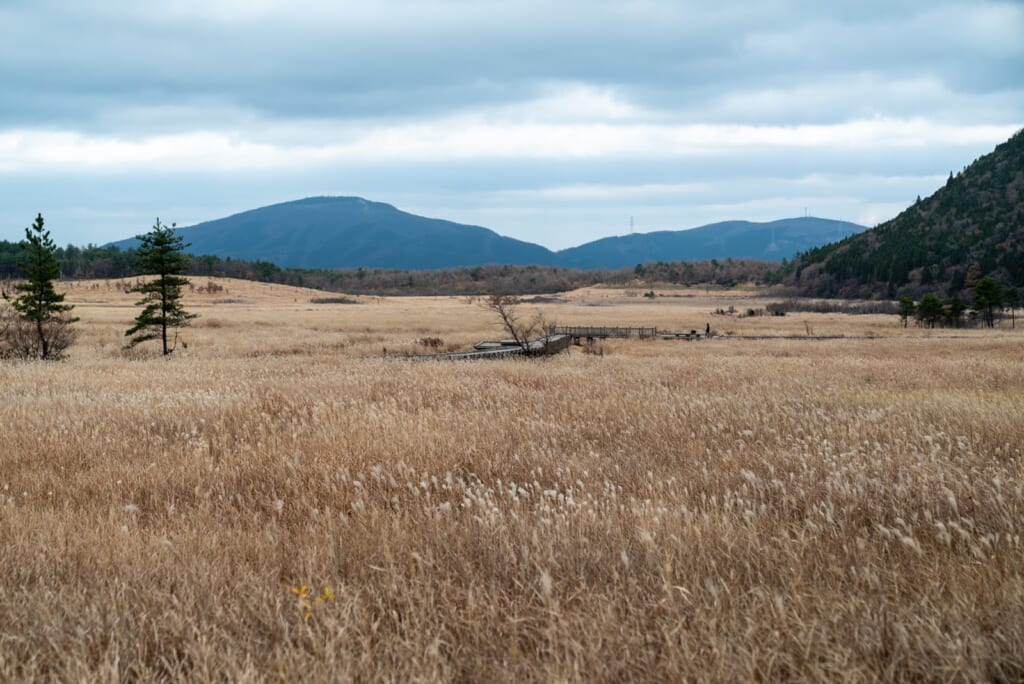 Although we were greeted with a moody, overcast sky on the late Autumn day we were there, the landscape was still spectacular, with a sea of Japanese silver grass swaying in the cool breeze and stretching across the plain to the base of the mountain range. In winter, the marshlands are covered in snow, but come spring the grasslands are set alight in a controlled burn. This is to preserve the diverse natural habitats of the marsh, and so that shrubs and trees do not become invasive. But the marsh is not blackened for long, soon the landscape transitions to a fresh green, covered in native wildflowers and home to birds and other wildlife.