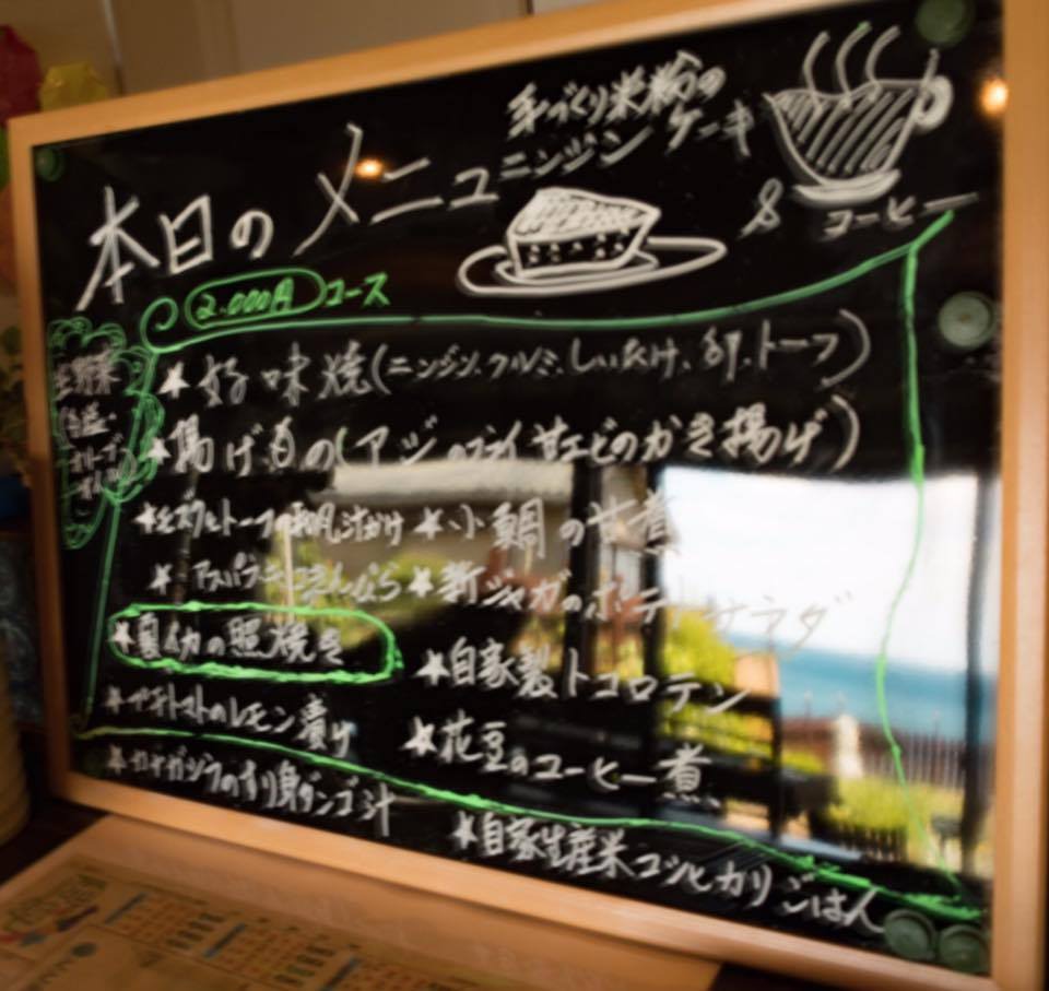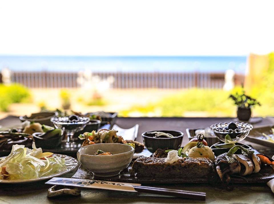 As good as the fish looked, I had made other plans; together with some members of the town hall, I had a reservation at a local restaurant called Nagi no Terasu Naka. The restaurant is in a homey setting, with tables arranged in a dining room with a view of the back porch and the ocean beyond. From here you can make out the shape of nearby Awashima Island: truly a breathtaking scene. This restaurant has Japanese-style set meals, with a unique twist.