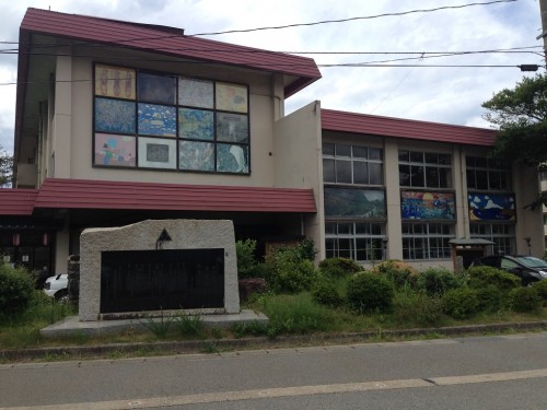 Later that day, I checked into my hotel for the night, Hachiman Onsen. The building is a stone’s throw from Gatsuki station, but I wasn’t actually certain I was at the right place at first. That’s because Hachiman is located inside a Junior High School! Of course, the school itself closed years ago, but a lot of the same facilities, even down to the artwork in the halls, was kept much the same. My room, on the second floor, was constructed from what was an 8th grade classroom. From my room, one can see a beautiful view of the mountains and the sea.
