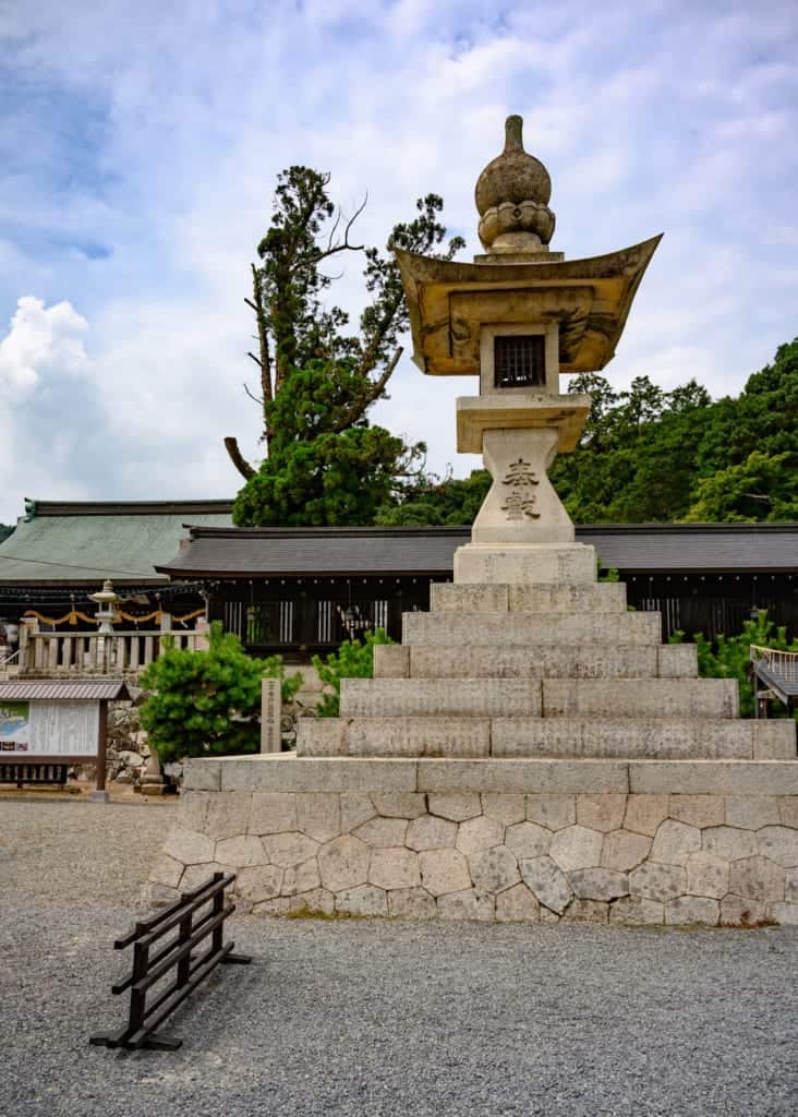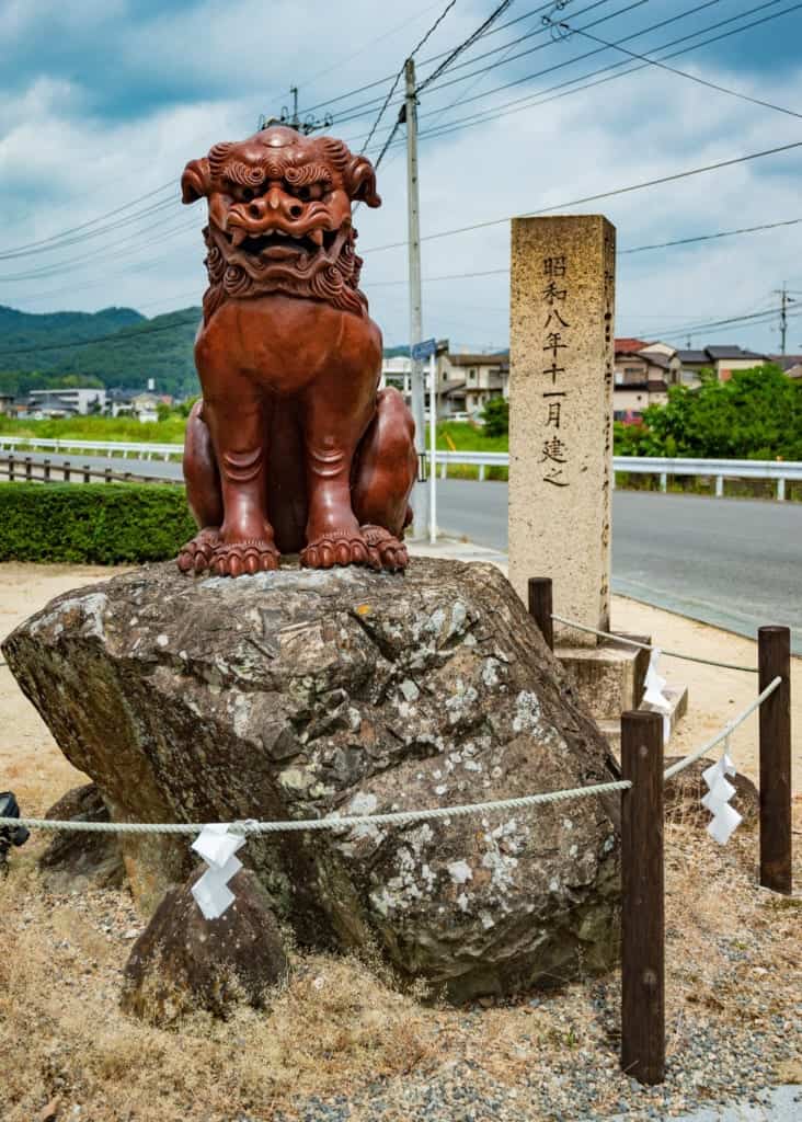 Kibitsuhiko Shrine’s torii gate is flanked by two large lion dogs, unusual in both size and material; these lion dogs were created using bizen ceramic techniques first created in this area over 800 years ago. Also in front of the shrine is the largest stone lantern in Japan, standing at 11.5m in height.