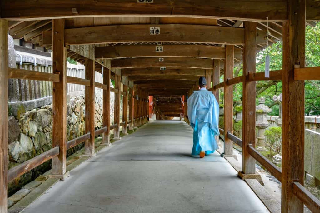 However, the most unique piece of architecture of Kibitsu Shrine is the 400m long covered walkway extending from the main buildings of the shrine. The priest explained that the walkway once connected Kibitsu to another shrine which is now gone. One branch of the walkway does connect the main buildings to the more remote Kamadono Hall where the Narukama Shinji ritual takes place. You will also pass a small shrine dedicated to Ebisu, god of good business.