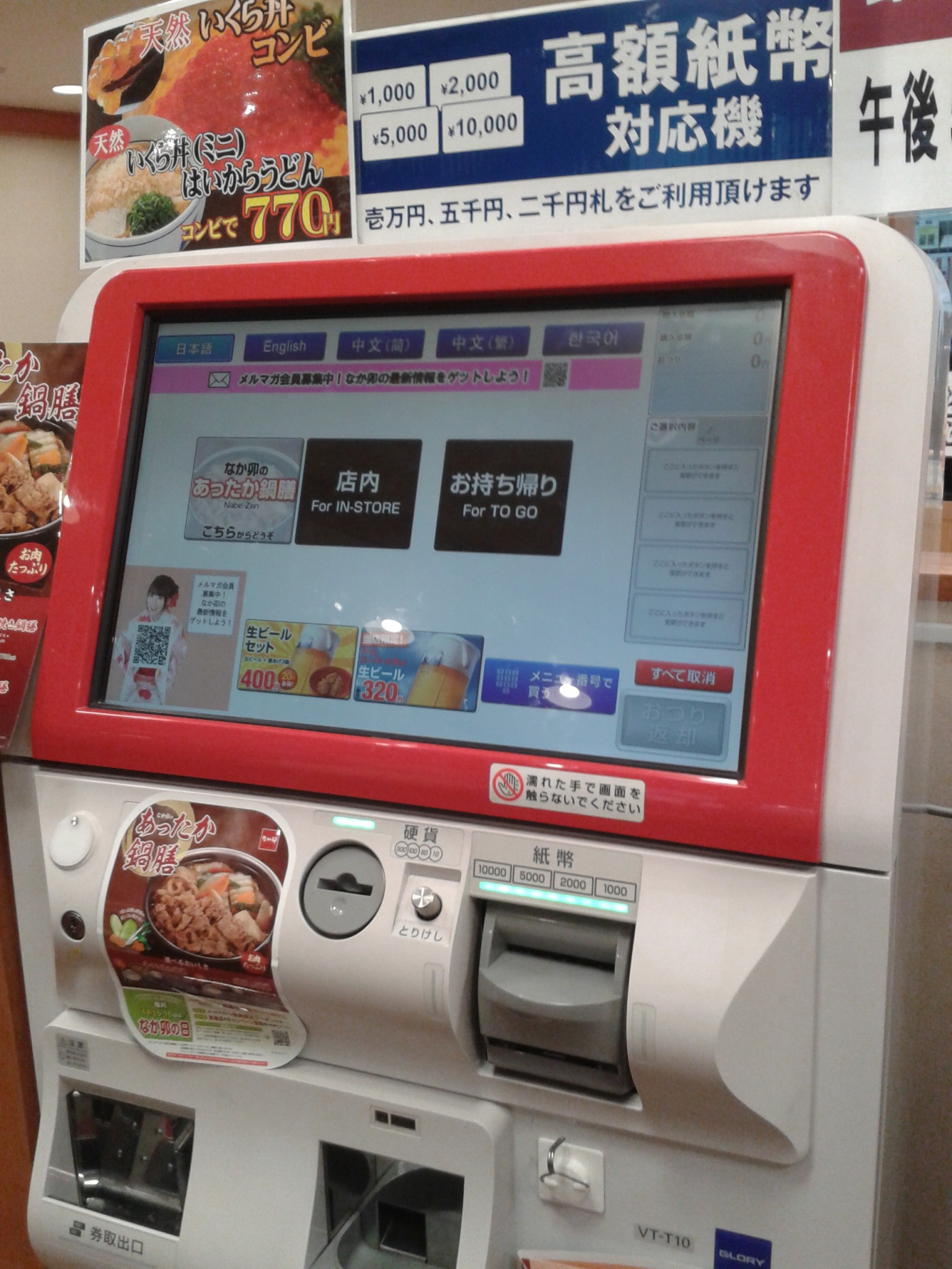Like buying something from a vending machine, or paying a parking meter, you pay at the machine, and you receive a ticket. Typically you will have a ticket for each dish –for example, I bought one “Duck Meat Udon” (udon is a different Japanese noodle to ramen) and a side of karaage, so I received two tickets.