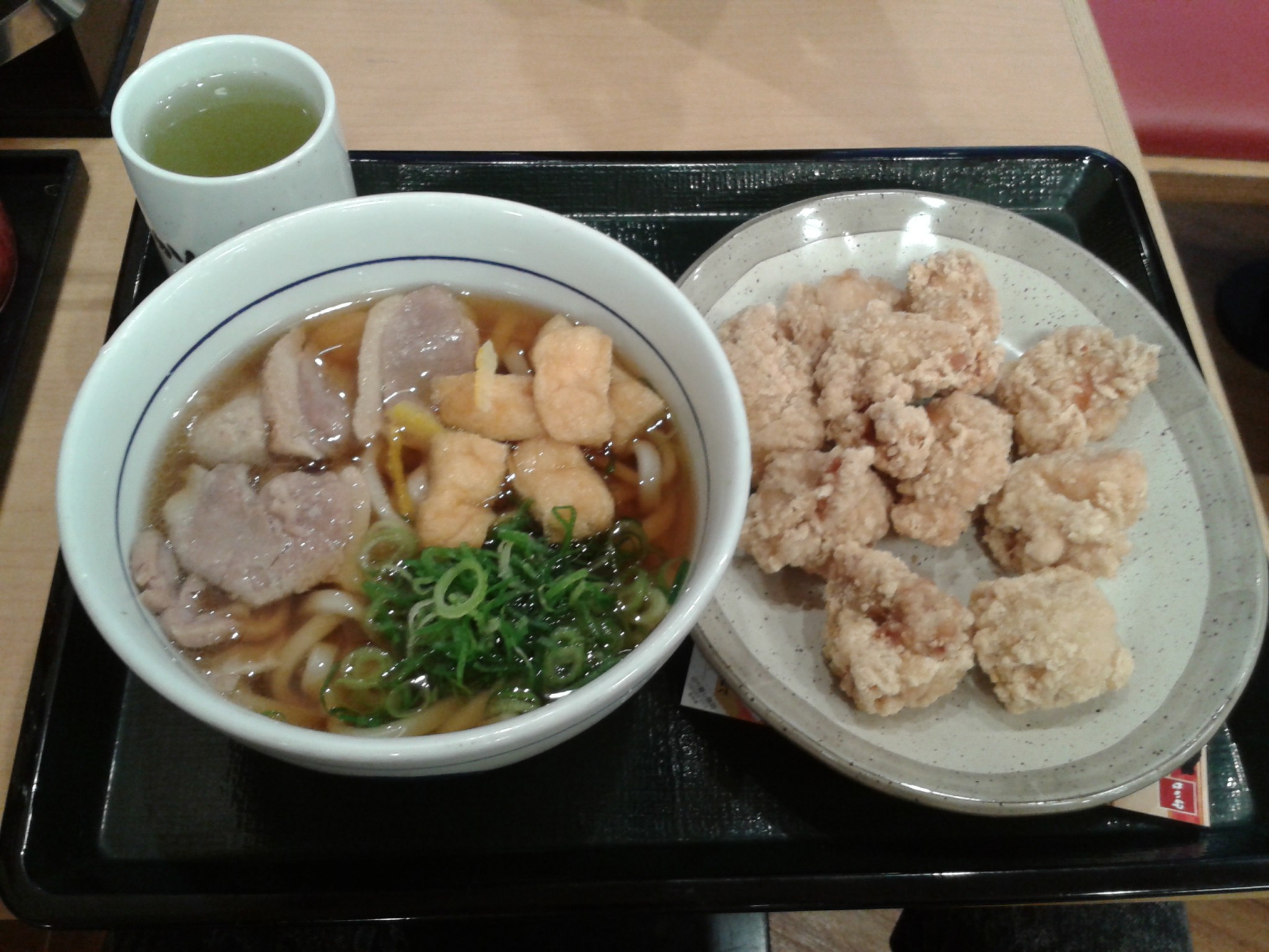 My duck meat udon was very good. It had fresh citrus in it, and the meat was cooked very well. The broth was somewhat weaker than my personal taste, so I used the aforementioned pepper and soy sauce. As for the karaage, it was crispy on the outside and juicy on the inside with some chili powder they were perfect!