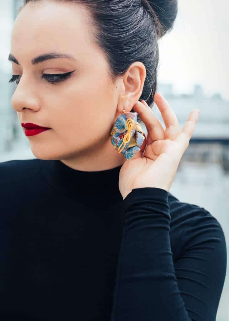 Smaller pieces are created from strips of fabric collected from the obi-making process. These become the candidates for the smaller pieces: earrings and accessories, made from the still beautiful portions of obi that would otherwise be discarded. The shimmering silk threads are often as brilliant as the precious metals they resemble.