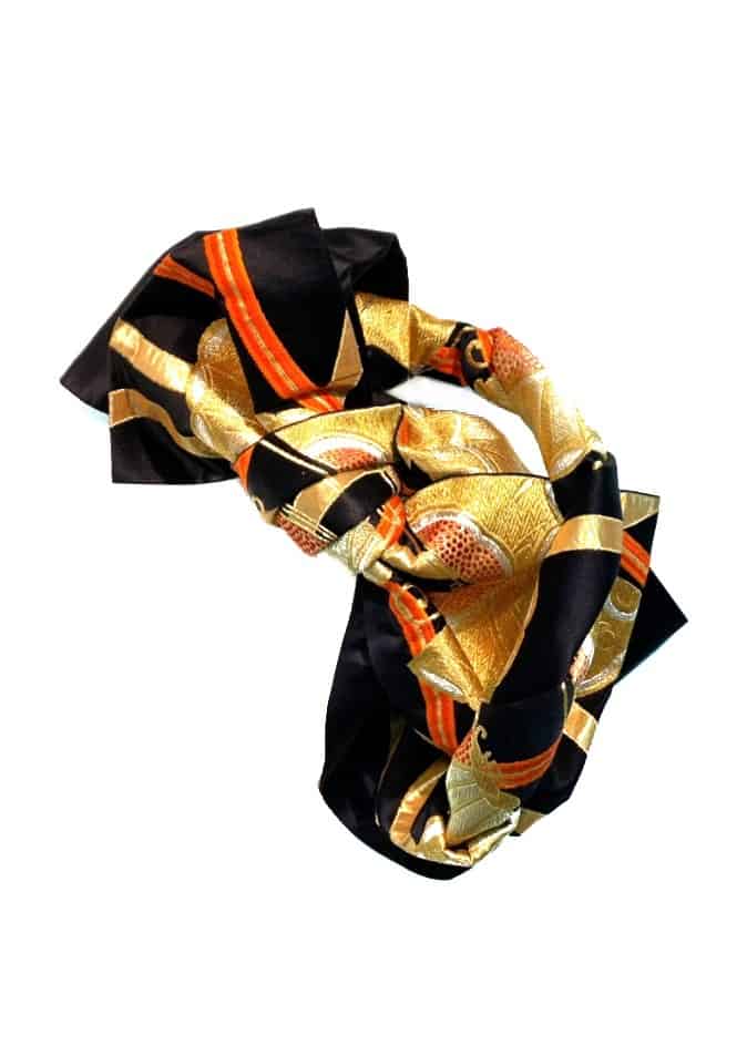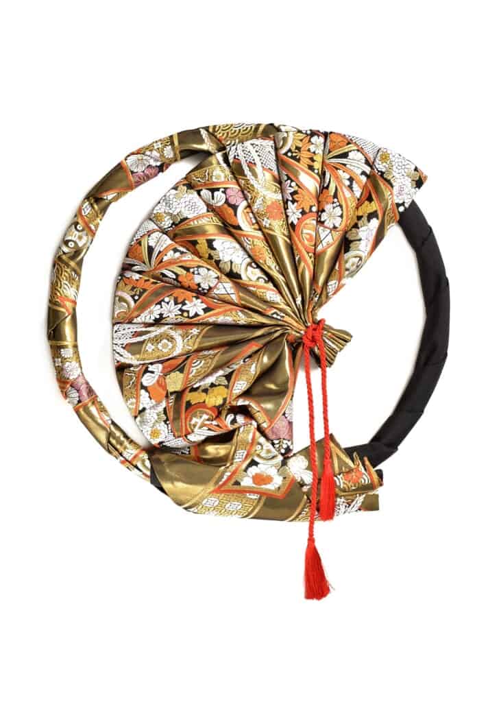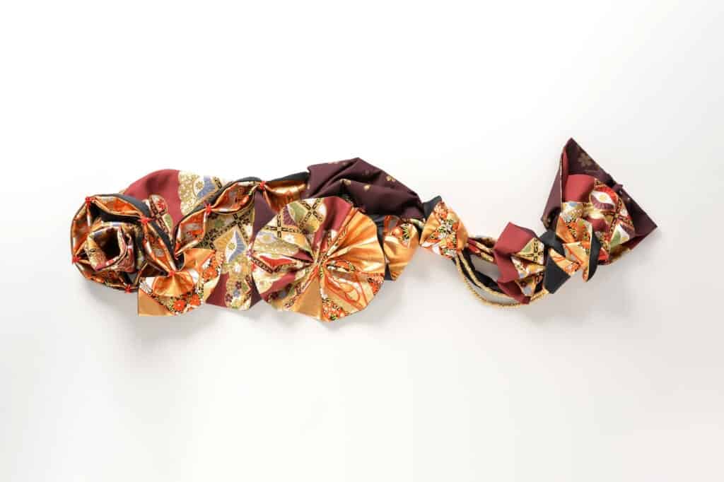 Still, Mami felt a tinge of regret in taking scissors to something that was created by another artisan for the purpose of binding a magnificent kimono with a graceful bow. What if she could compose a work of art from the obi without destroying it? She considered the challenge carefully, eventually settling on the idea of folding and twisting the recycled obi into elegant shapes that could be displayed hanging on a wall or sitting on a table. Thus was born Oriobi, a portmanteau of the Japanese words origami (the art of paper folding) and obi.