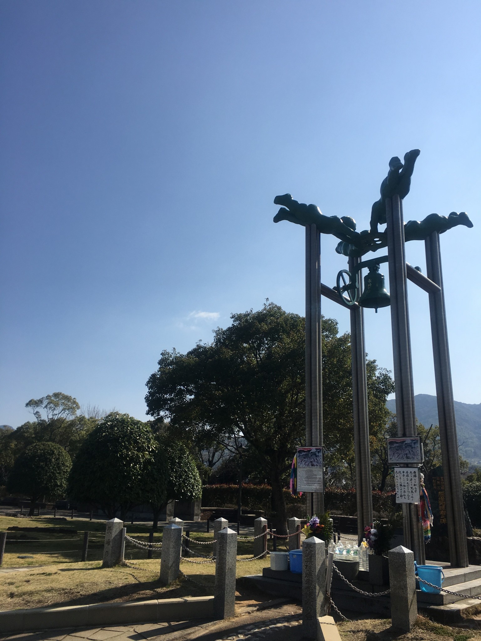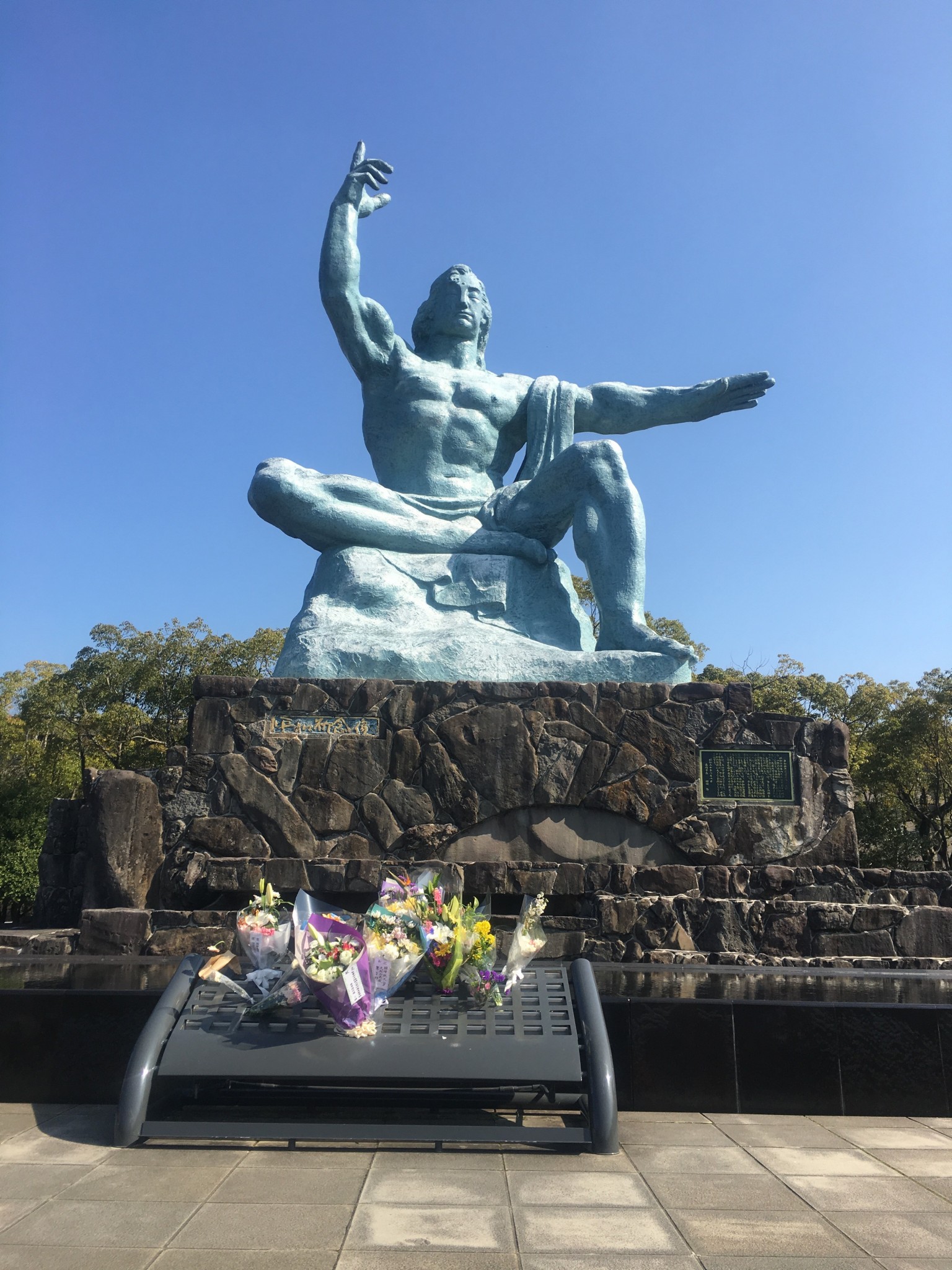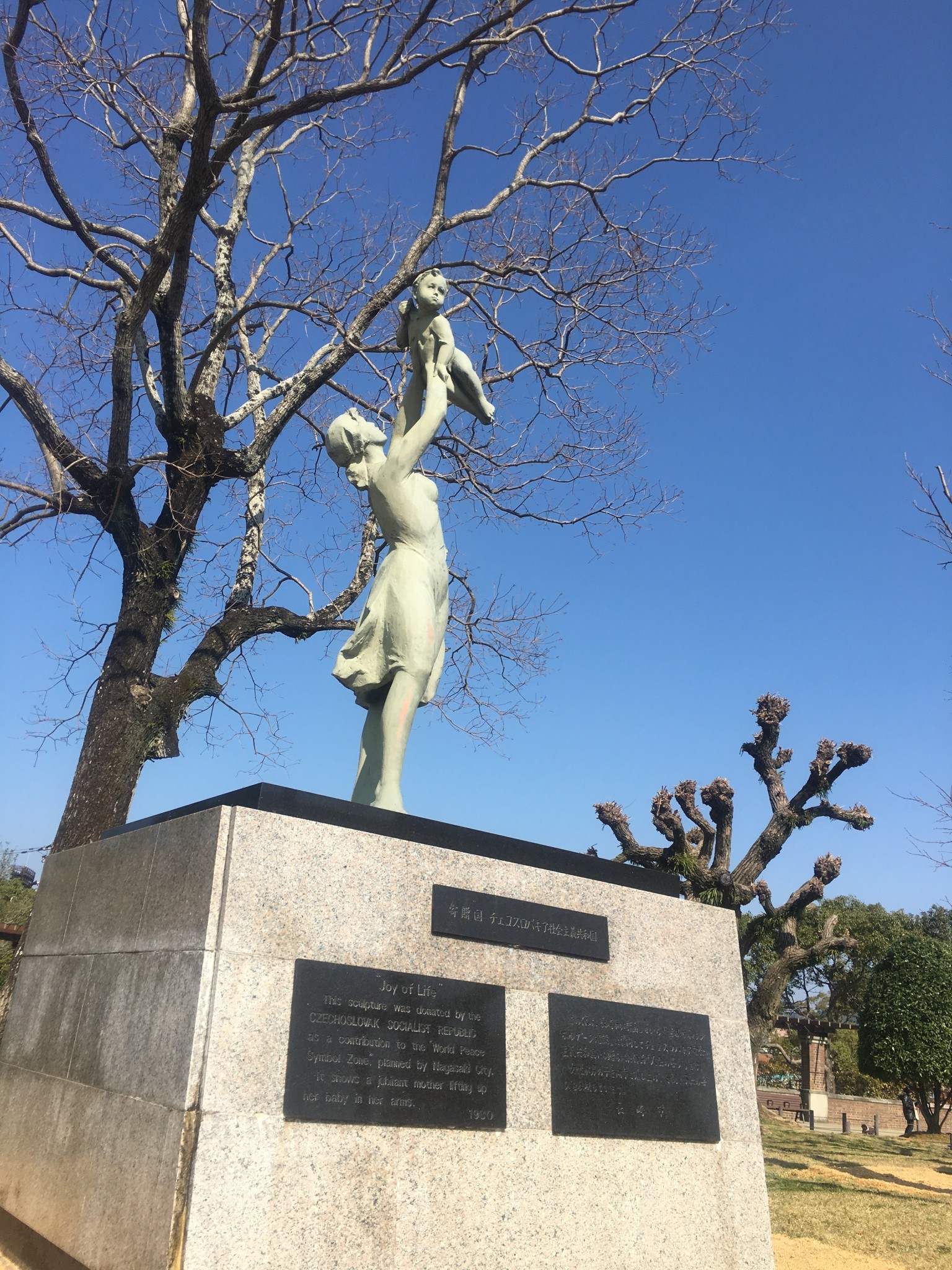 The surrounding area of Nagasaki Peace Park is filled with statues and monuments. There is a black pillar marking the atomic explosion’s center in Hypocenter Park with a list of bomb victims, as well as a peace bell and monuments donated from various countries. Every August 9, a memorial service for the dead and a peace ceremony is held in front of the Heiwa Kinen-zo statue to commemorate the tragedy and pray for the souls of bombing victims and for world peace.
