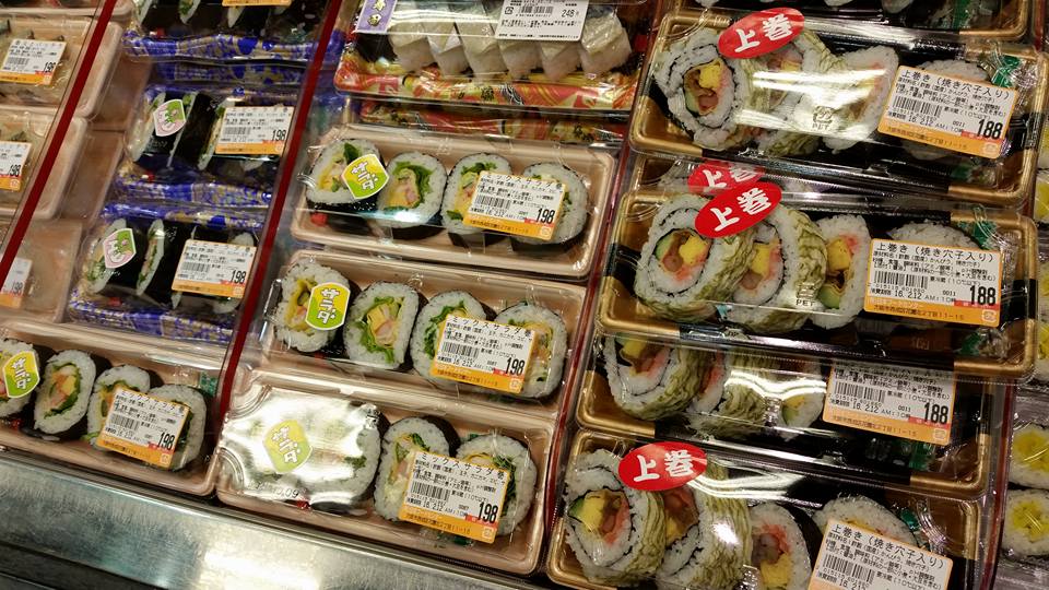 Japanese sushi rolls can be bought in any supermarket or convenience store in Japan. A supermarket sushi roll costs from 100yen to 500yen, according to how large or fancy they are. The key difference between Japanese rolled sushi and western rolled sushi, is the length. Japanese rolled sushi is always cut into bite-sized pieces, whereas western variations of the roll often come in about 2-3 inches long. Japanese sushi rolls often come in little plastic containers, alongside some soy sauce and wasabi.