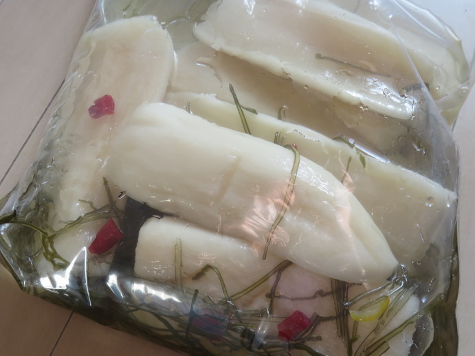 The next step is to marinate your daikon in new ingredients – a mix of sake, sugar and vinegar. For each 1kg of daikon you need 160g of sugar, 40cc of sake and 40cc of vinegar. After draining any water from the daikon, mix up these ingredients well and pour them over the daikon. Mix one more time and leave it to marinate for another day. The daikon will soak up the flavour and soften.
