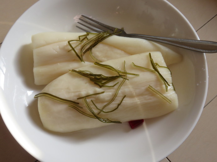 You then cut the daikon into large piece and lay it in the bottom of a large tub. After this, sprinkle salt over the top – the amount of salt is also determined by the weight of daikon.