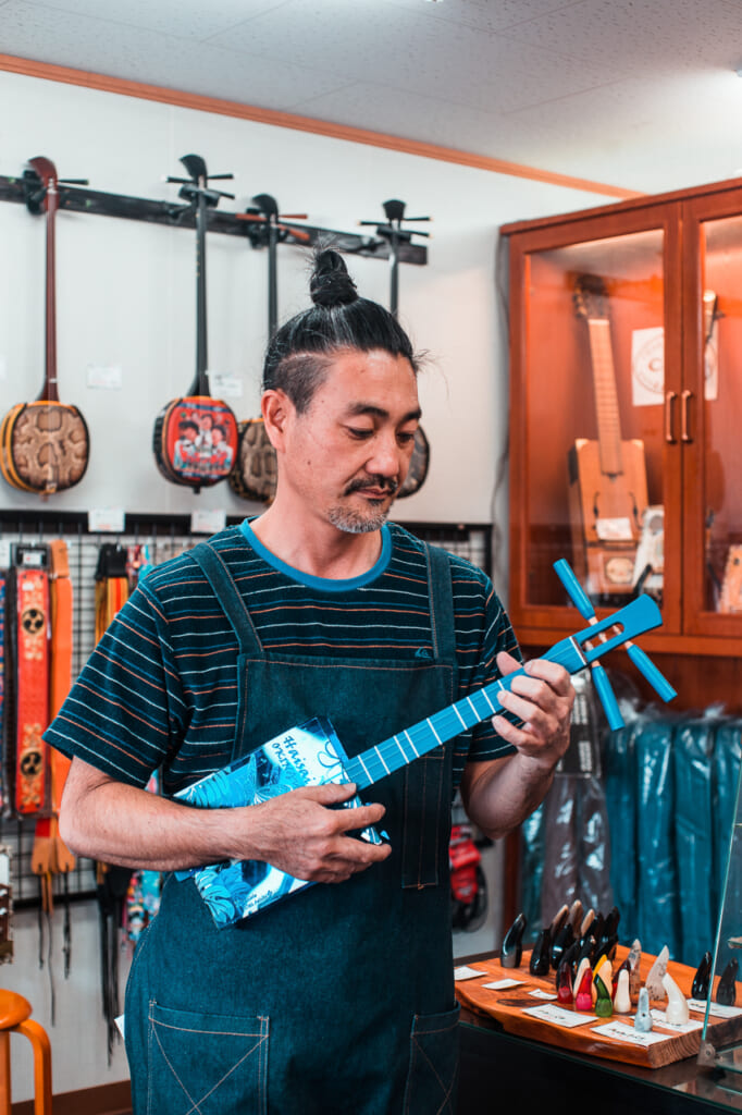 Machida-san welcomes me at Machidaya, a small sanshin store and workshop located in Yomitan village, close to the turquoise sea off the coast of Okinawa. It’s the best environment to learn about this traditional Japanese instrument.