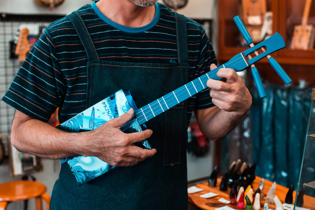 “Alberto inquired about the possibility of developing an instrument that would combine the sounds of the ukulele with the sanshin.” Machida-san explains. “For many years, we tried different techniques and finally managed to achieve the result we were hoping for.” The sanlele is born from the combination of the ukulele body and the three strings of the sanshin, reproducing soft and melodic sounds.