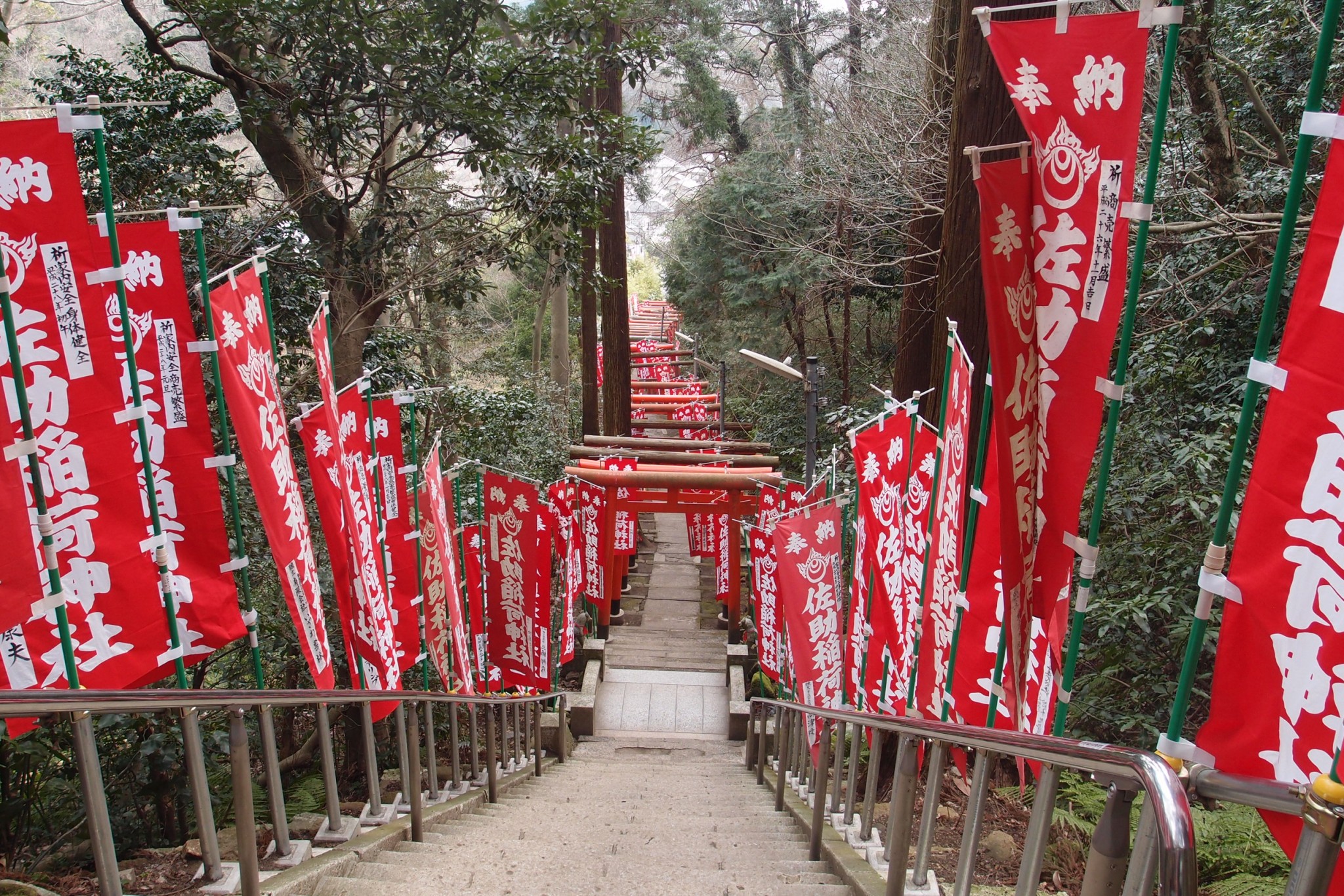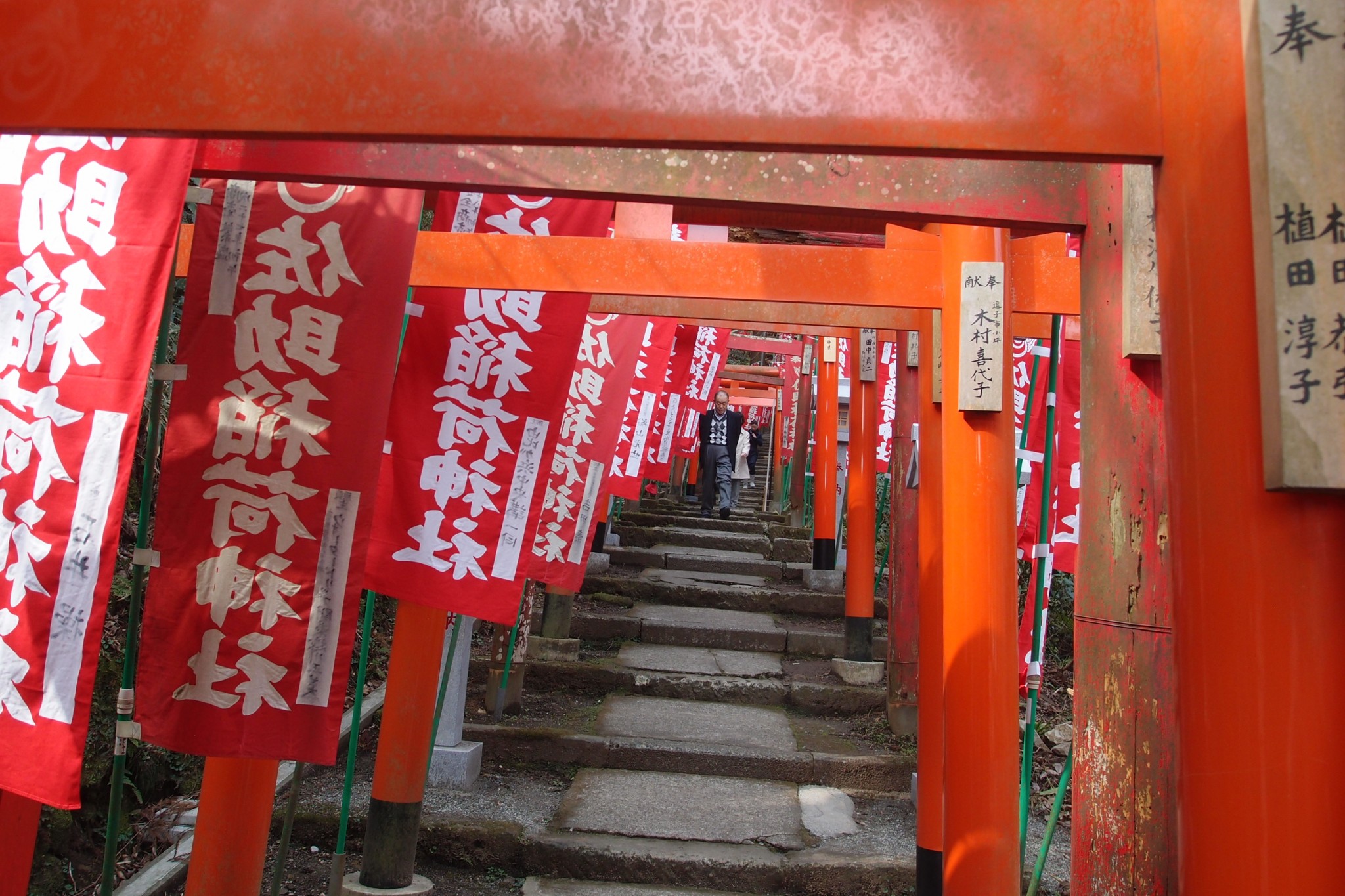 Climbing the stairs, each narrow step required a careful lift. I imagine this is habitual for the old shrine keepers, going back hundreds of years. The tang of age is on the place. One legend behind Sasuke-Inari says that it was a village, and one of its old denizens had visited the dreams of future shogun Minamoto Yoritomo.