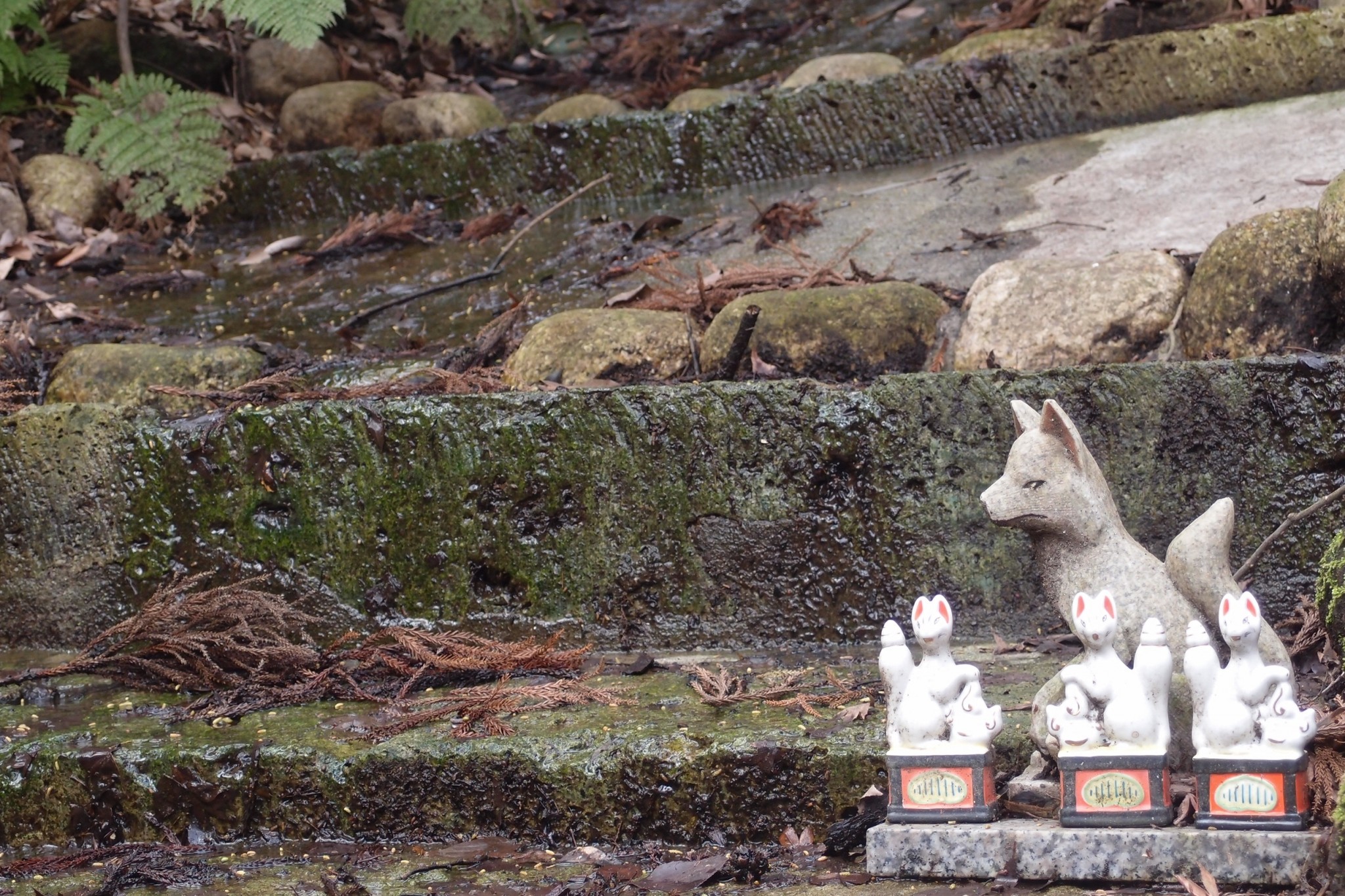 A mound of lake-bottom-looking sod stood deposited onto the ground by the Haiten building. The image’s earthiness fits the sanctification of Shinto well, a spotted vision of transplanted lake-bottom greens. It is Inari’s, obvious for the foxes perched on every rock’s cranny.