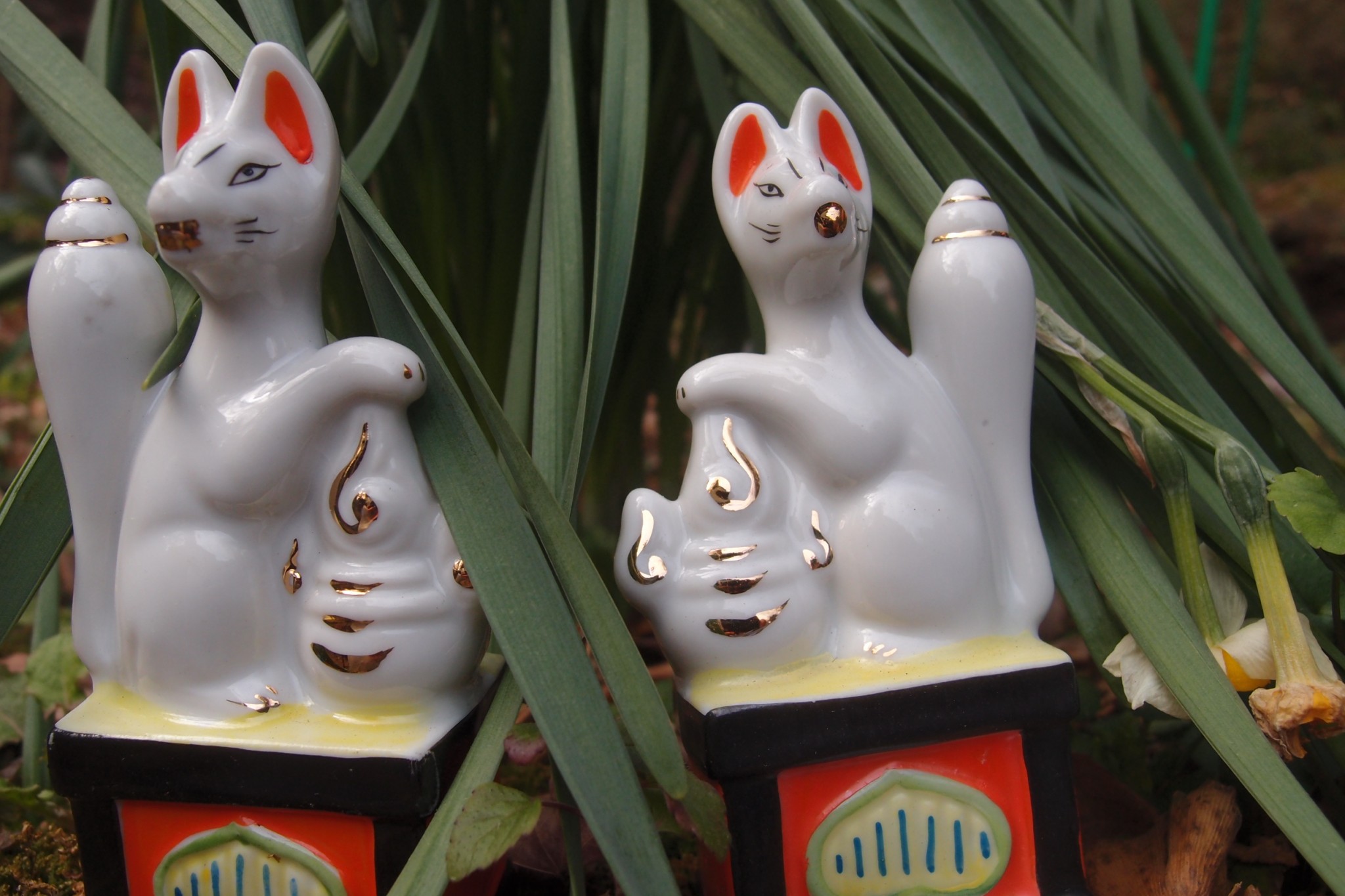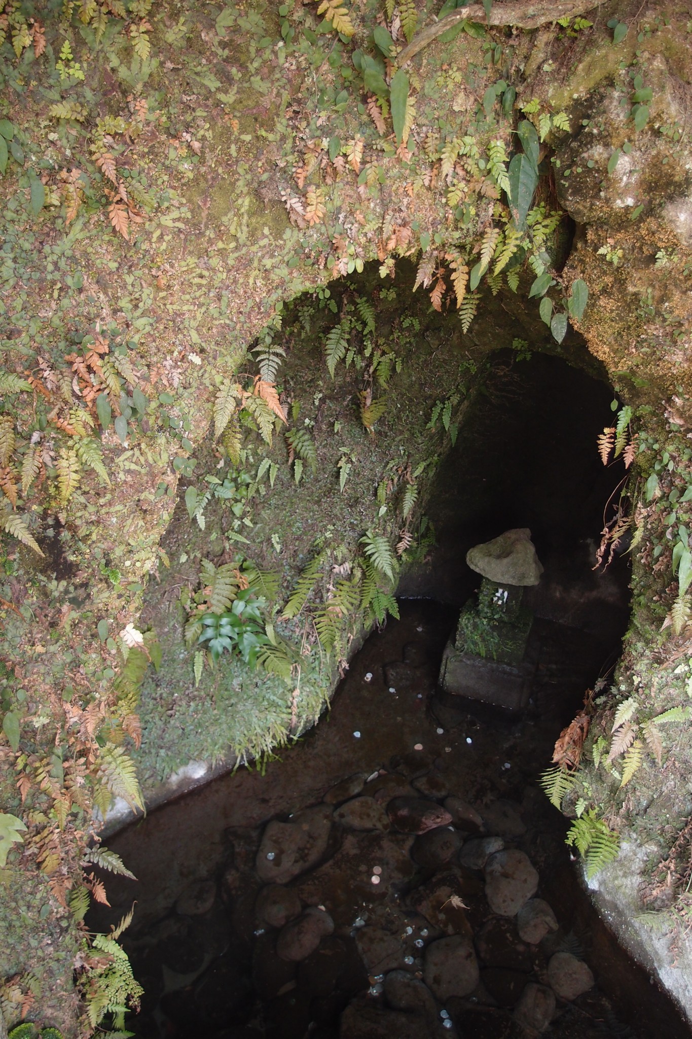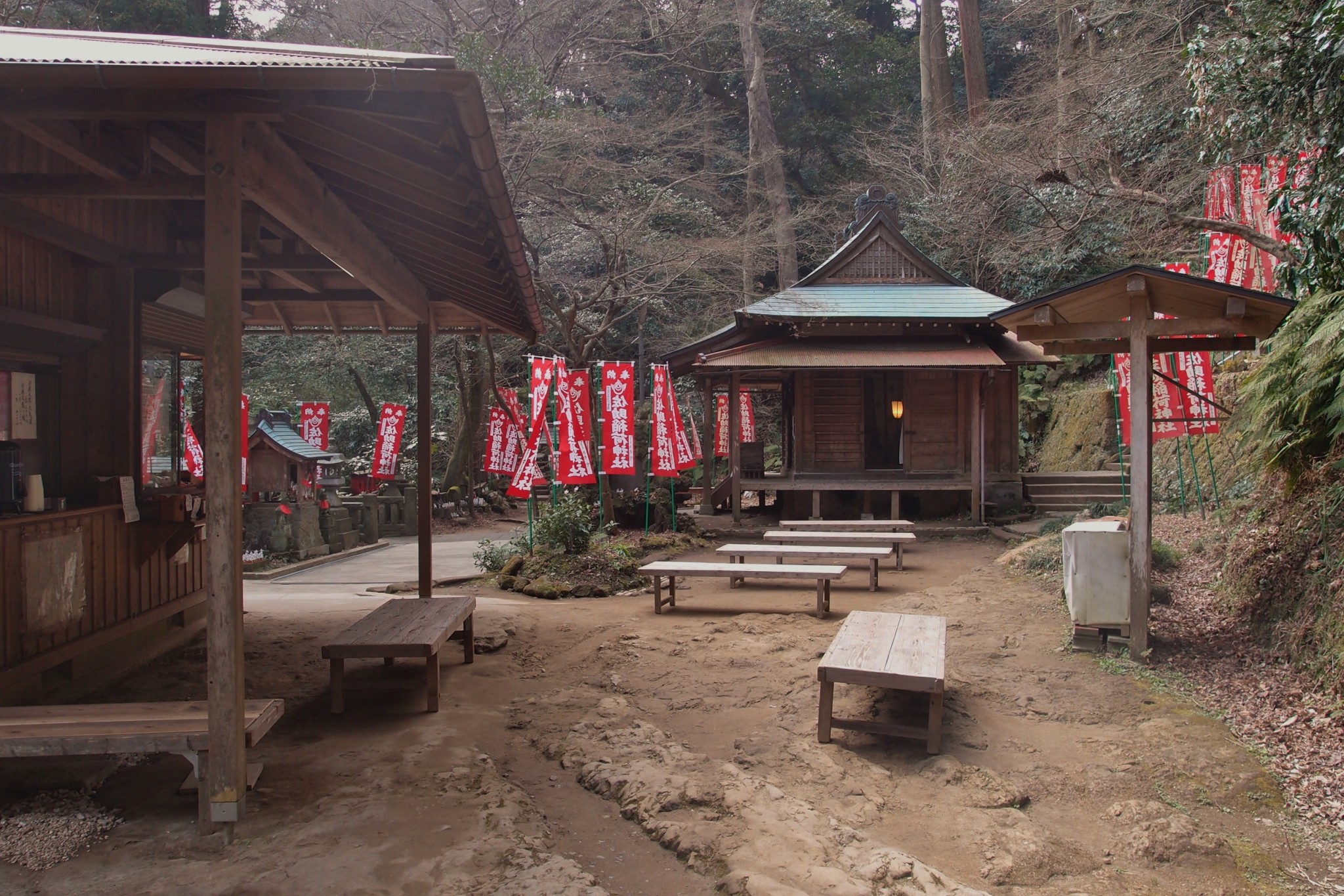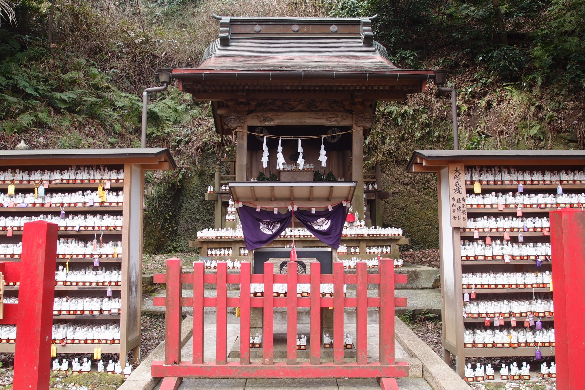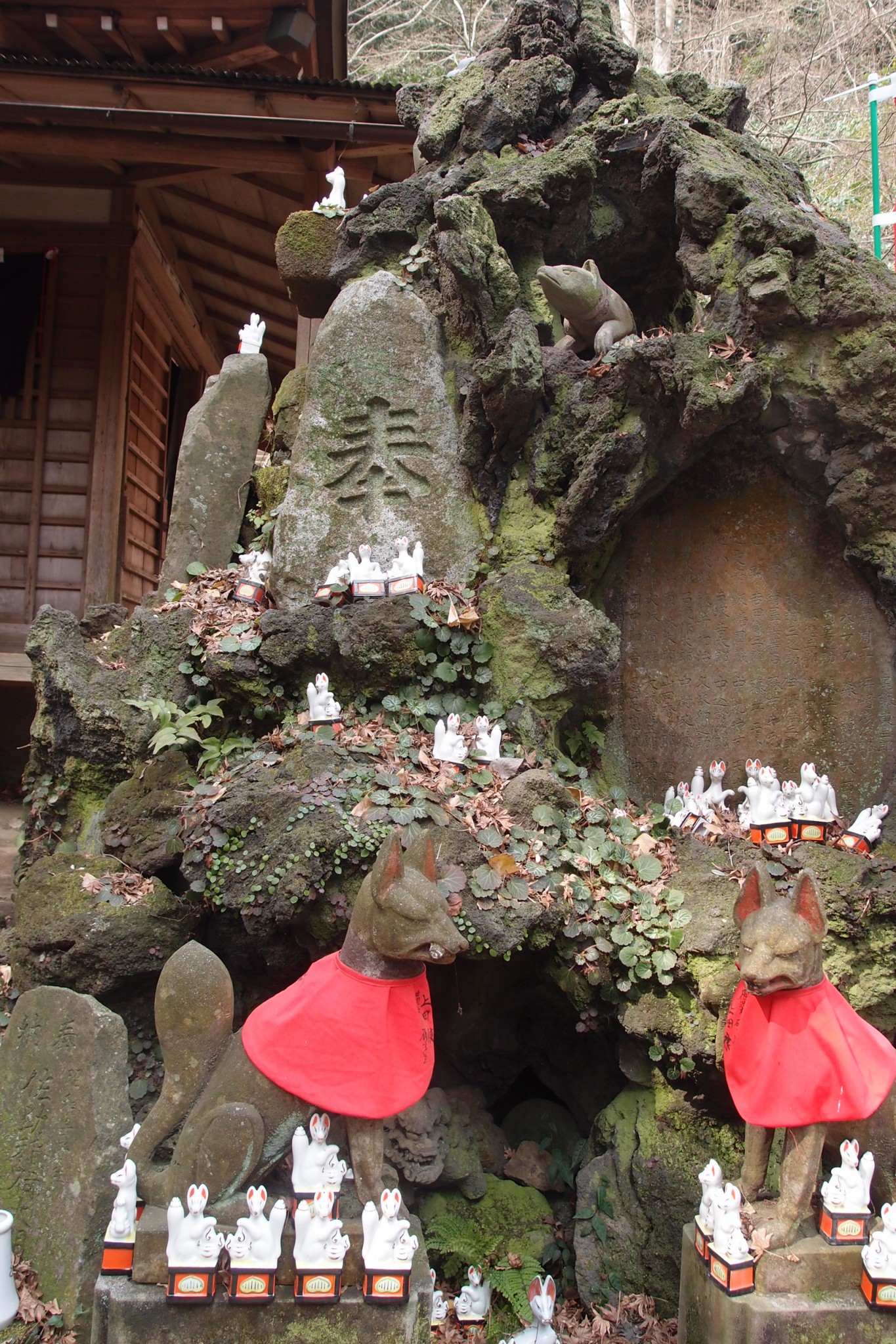 A little altar peaks out from the shrine’s far side. It enshrines the deep earth animism of Shinto; the little holy space is one of Kamakura’s springs. To the side are shelves of small foxes. They seem lined to dry after a watery passage into the spirit world.