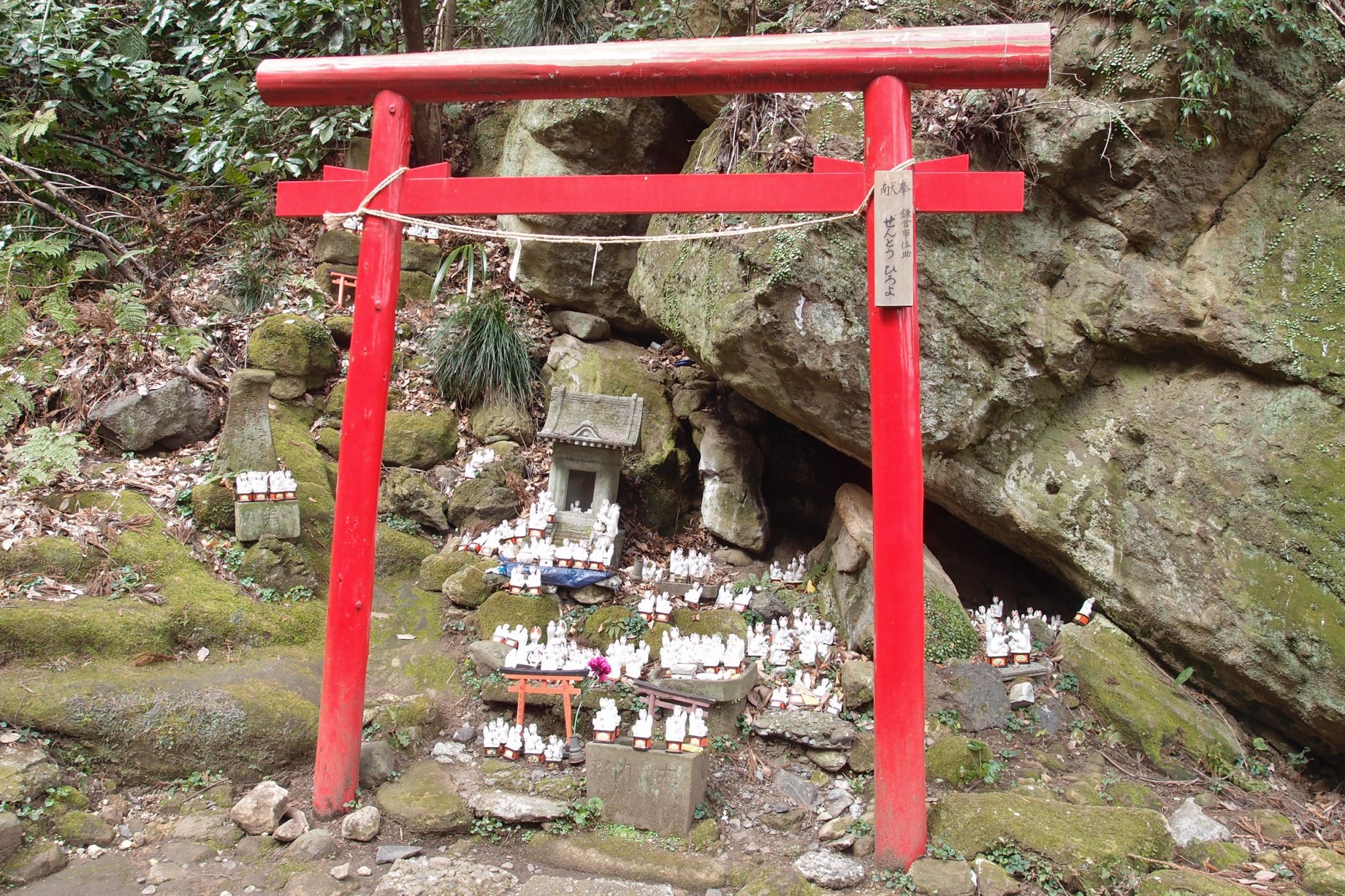 Access: From Kamakura station, walk 15 minutes west. From Kita-Kamakura station’s west exit, walk five minutes south. On your right is the entrance to the Daibutsu hiking course. Continue walking for an hour or so. When you see the sign bellow, turn left. The top post indicates “Sasuke-Inari Shrine, three minutes.”