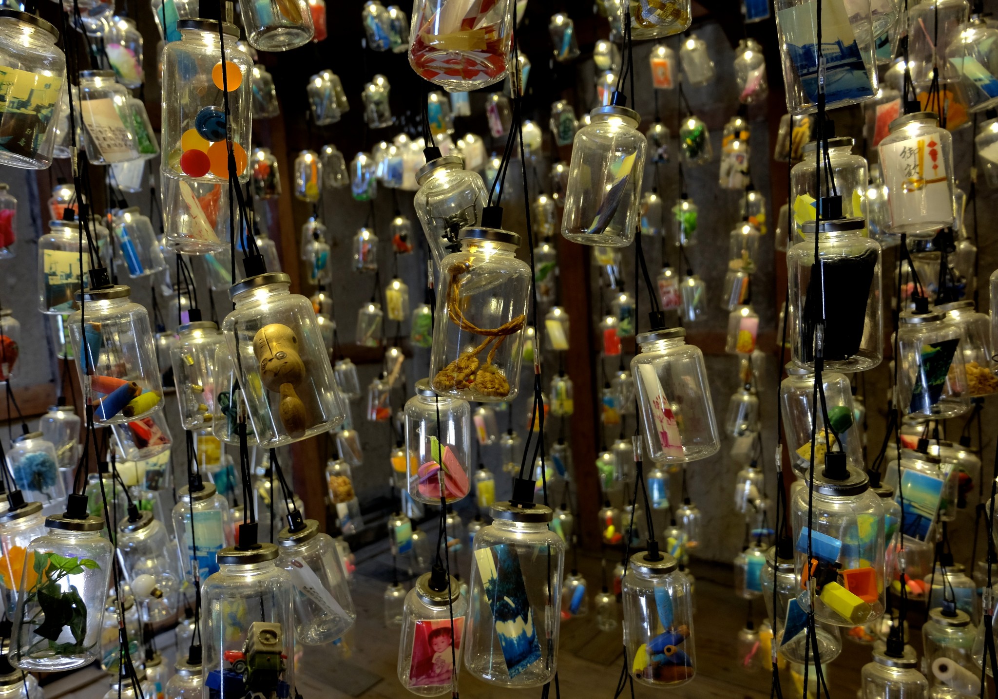 My favorite piece was Mayumi Kuri’s “Memory Bottle” art site. It was installed into an old storage building for boating supplies – the ceiling is very high and the interior is filled with delicate glass bottles with little lights inside the hang from the ceiling, each containing different items. Kuri actually involved the Ogijima community on her piece, harvesting ‘memories’ from the villagers in the form of small knickknacks, toys and photos. In this way, she gives viewers an idea of the things that the people of Ogijima hold dear to their hearts, allowing us to see into their lives.