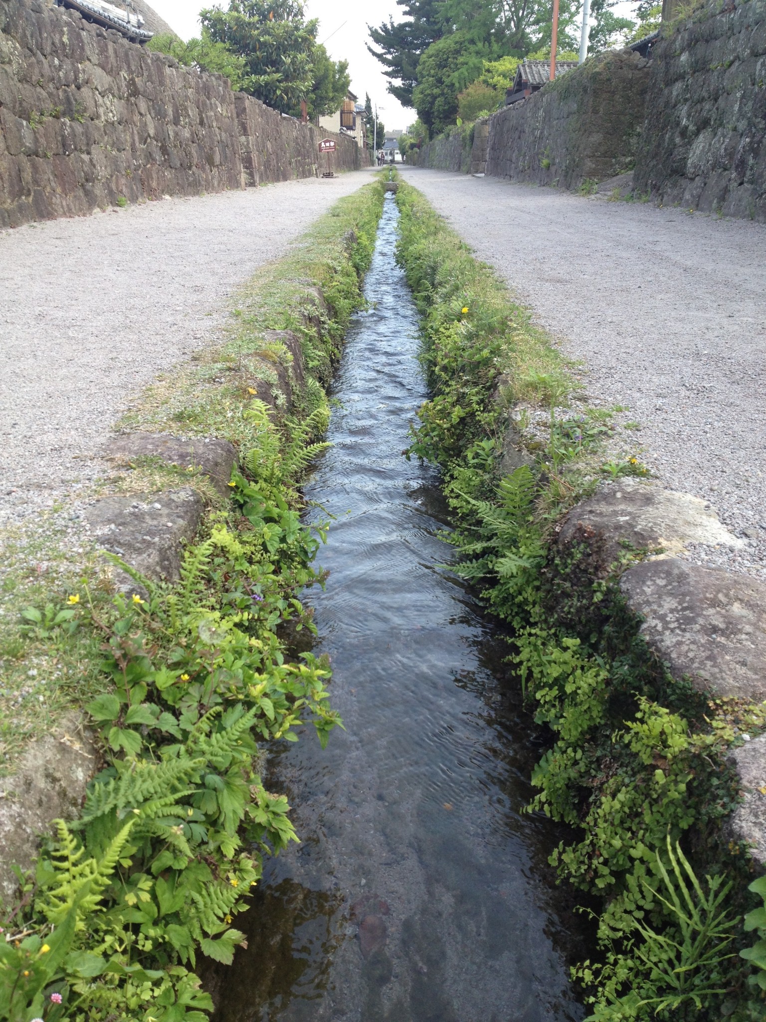 This samurai district was built in 1600s, during the feudal era of Japan and concurrent to the castle’s founding. Noted for a stream running down the center of its lane, I expected it must recall medieval Europe’s refuse ridden streets. Rather than a dirty sluice ditch, I was treated to spring waters flowing clean. Lilliputian ferns prickled out from between the outline of volcanic rock to each side. The stream bed delineated the diverted spring flow.