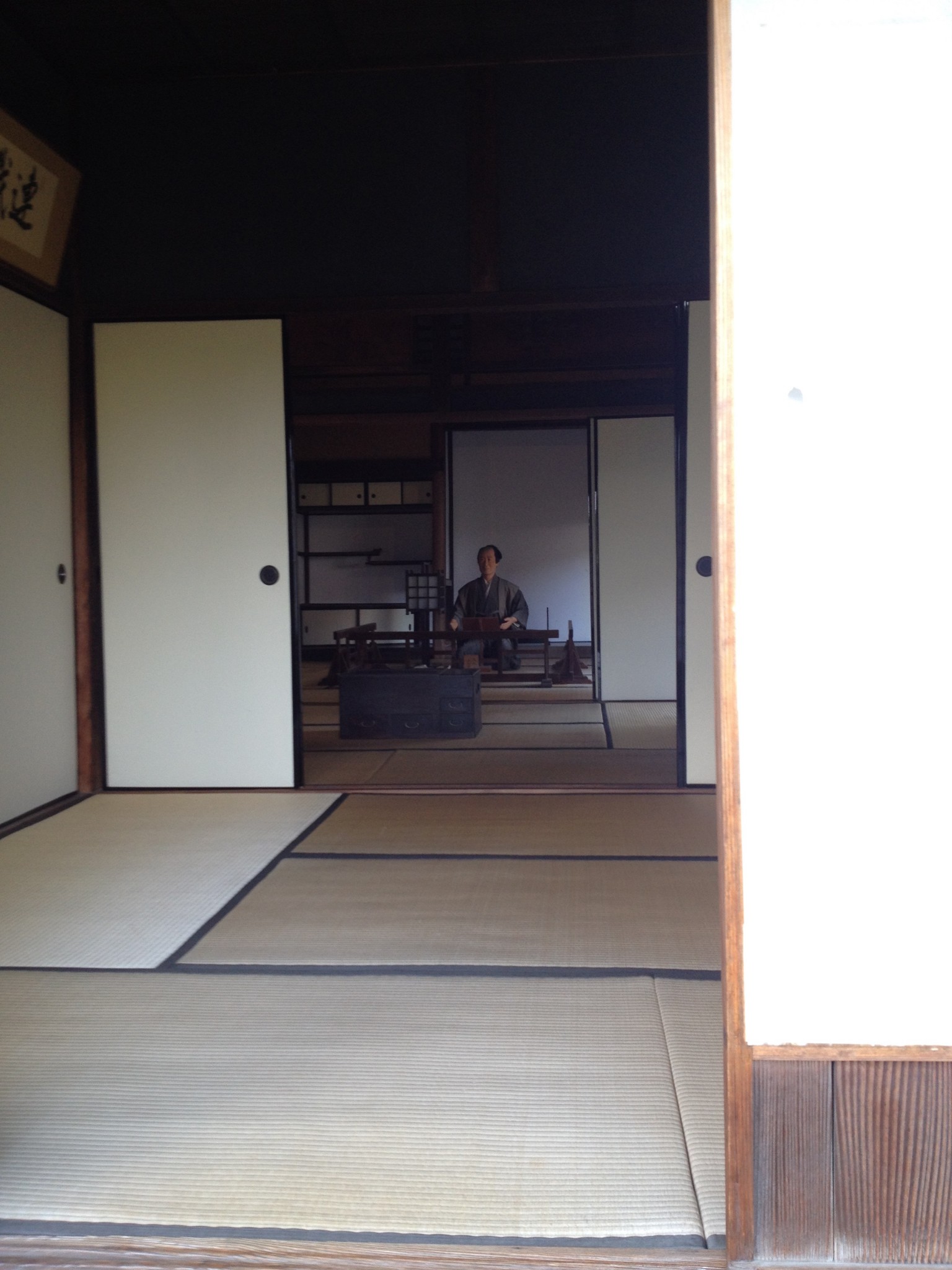 The first house, Shinozuka house, is entered to the plot’s rear. Trees limn the wall in back, a natural barrier. Fruit grows fresh in this neighborhood as encouraged by the local lords, and though I saw none tipping the branches, I imagined a plump drooping in Kyushu’s impressive rains. No fructiferous dress, they weightlessly pointed up to another local sight: topping the building was a thick thatch roof. Affixed to the back was an old ofuro (Japanese bath) room, a shed huddled under the eaves. This was the only room of the three houses where entry is prohibited. In samurai hospitality, other rooms are open invitation. It’s a little mystifying to look in on a shogi maze to mannequins modeled after long ago residents.
